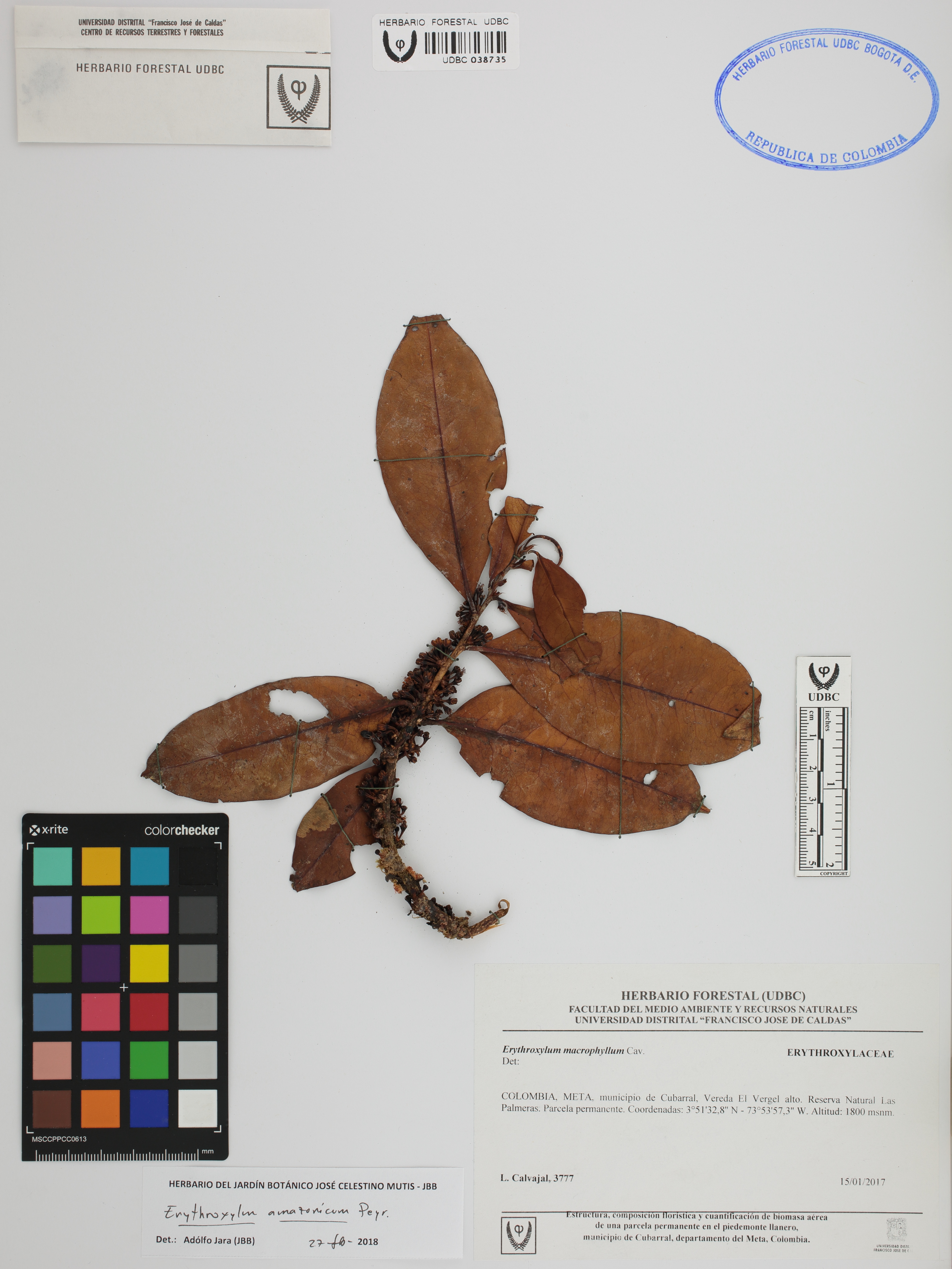 Fotografía del ejemplar Carvajal, L. 3777, determinado como Erythroxylum amazonicum en el año 2017