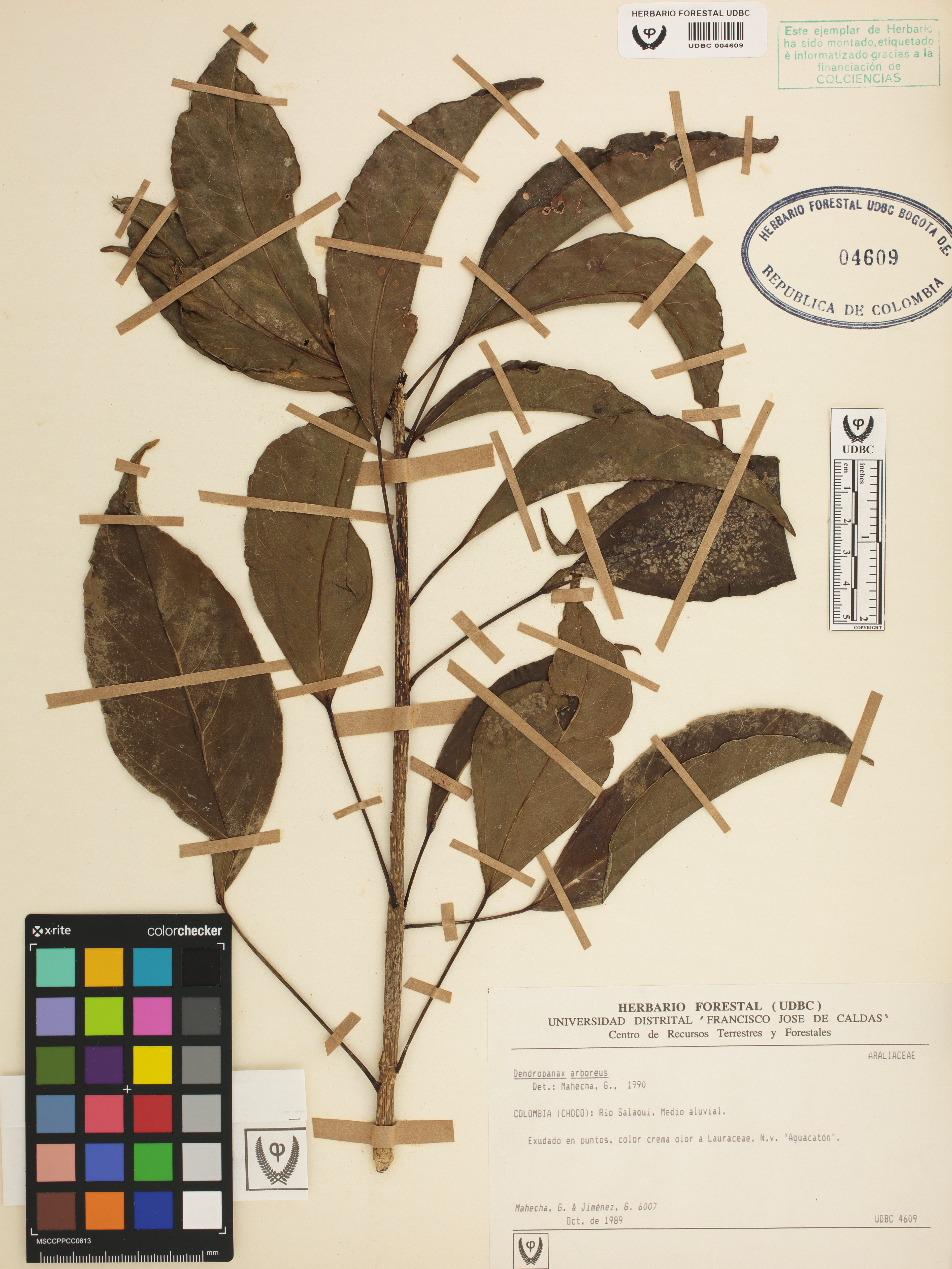 Fotografía del ejemplar Mahecha, G. 6007, determinado como Dendropanax arboreus en el año 1990