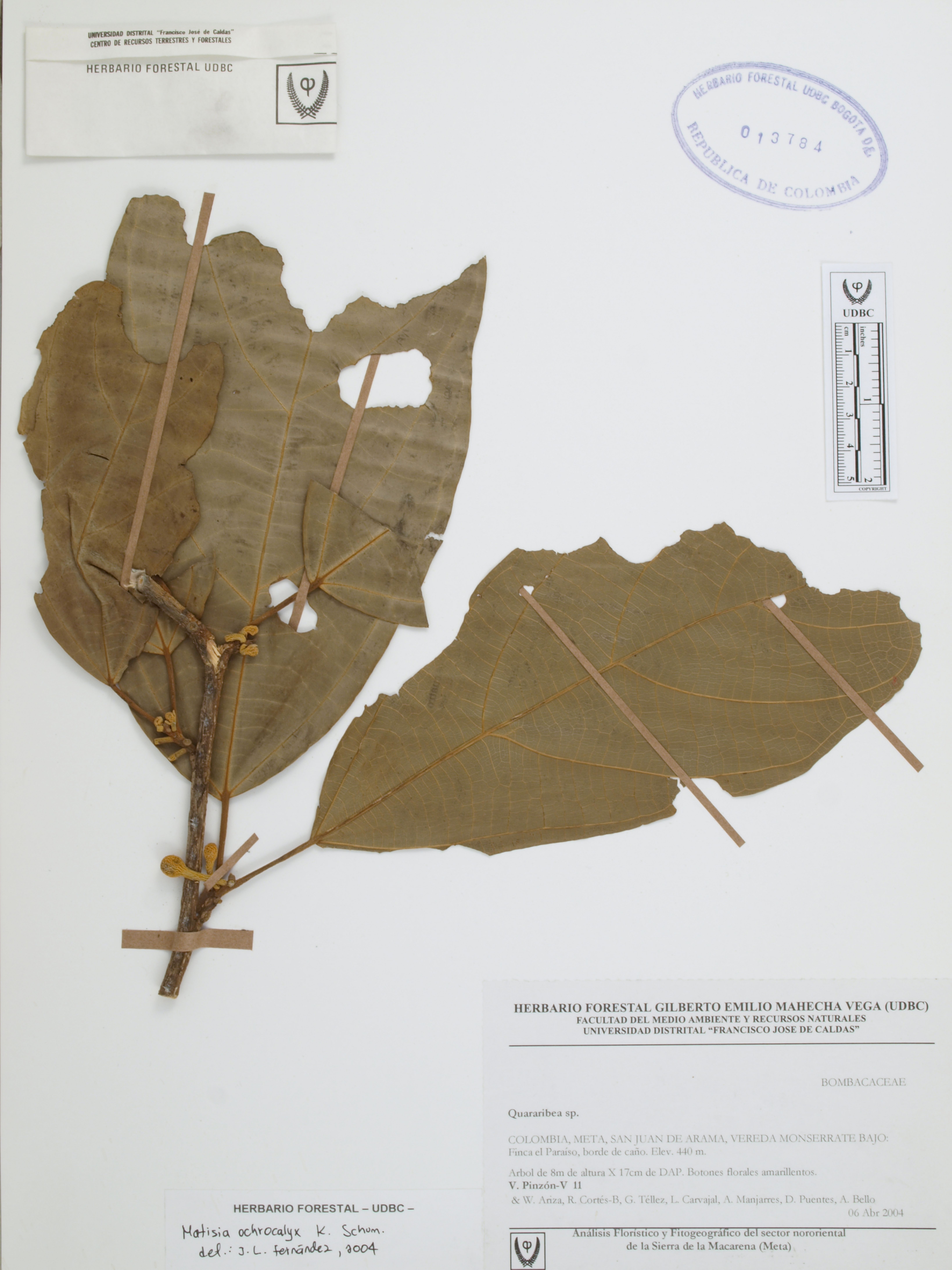 Fotografía del ejemplar Pinzón, V. 11, determinado como Quararibea sp.
