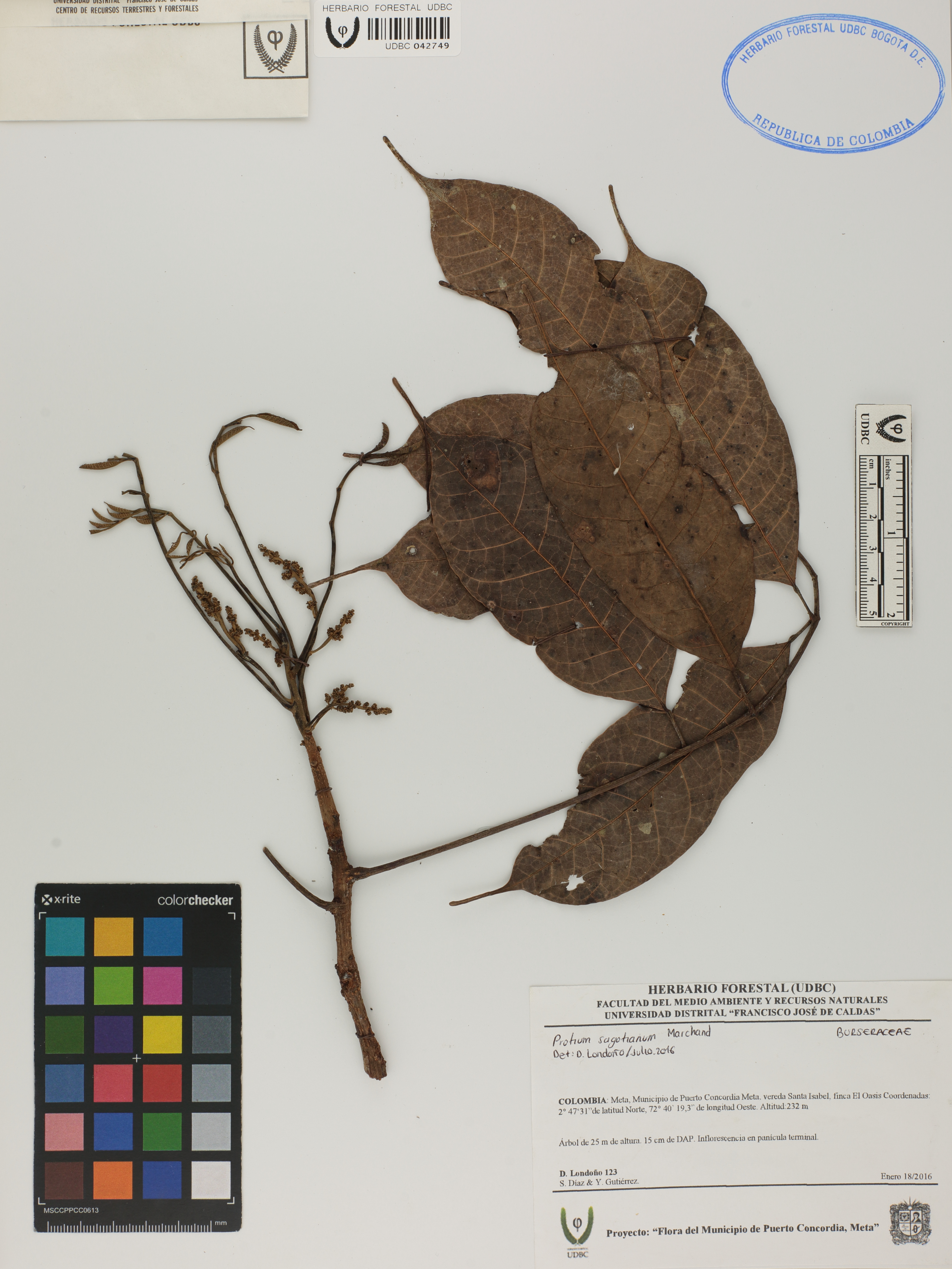 Fotografía del ejemplar Londoño, D. 123, determinado como Protium sagotianum en el año 2016