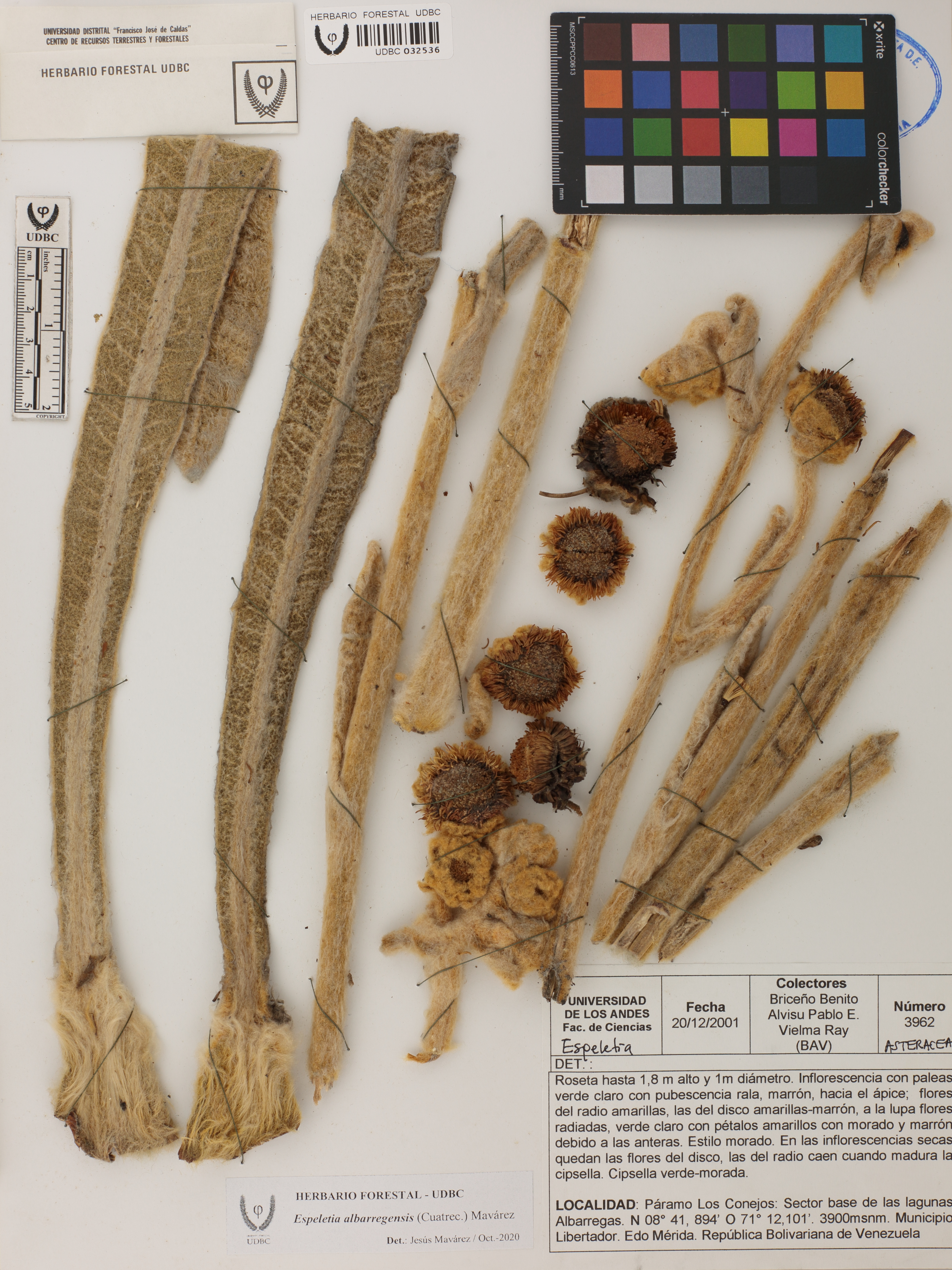 Fotografía del ejemplar Briceño, B. 3962, determinado como Espeletia albarregensis en el año 2020