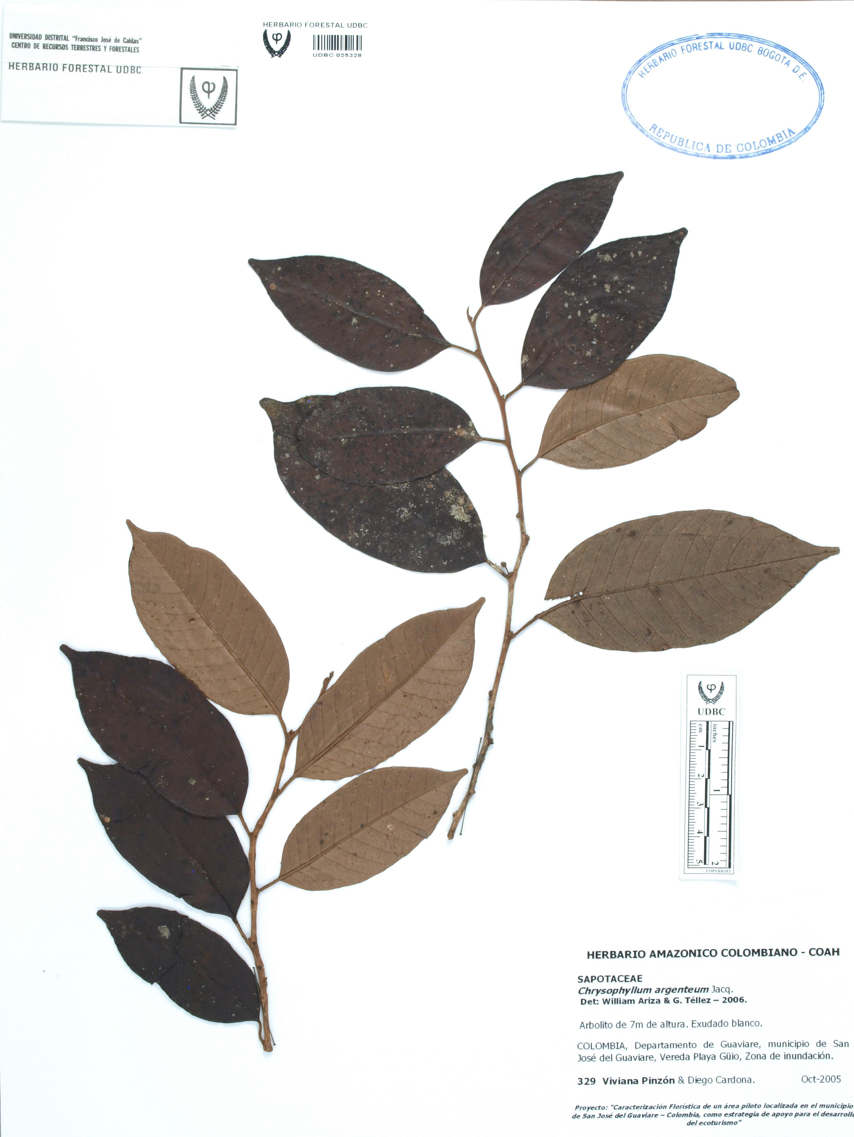 Fotografía del ejemplar Pinzón, V. 329, determinado como Chrysophyllum argenteum en el año 2006