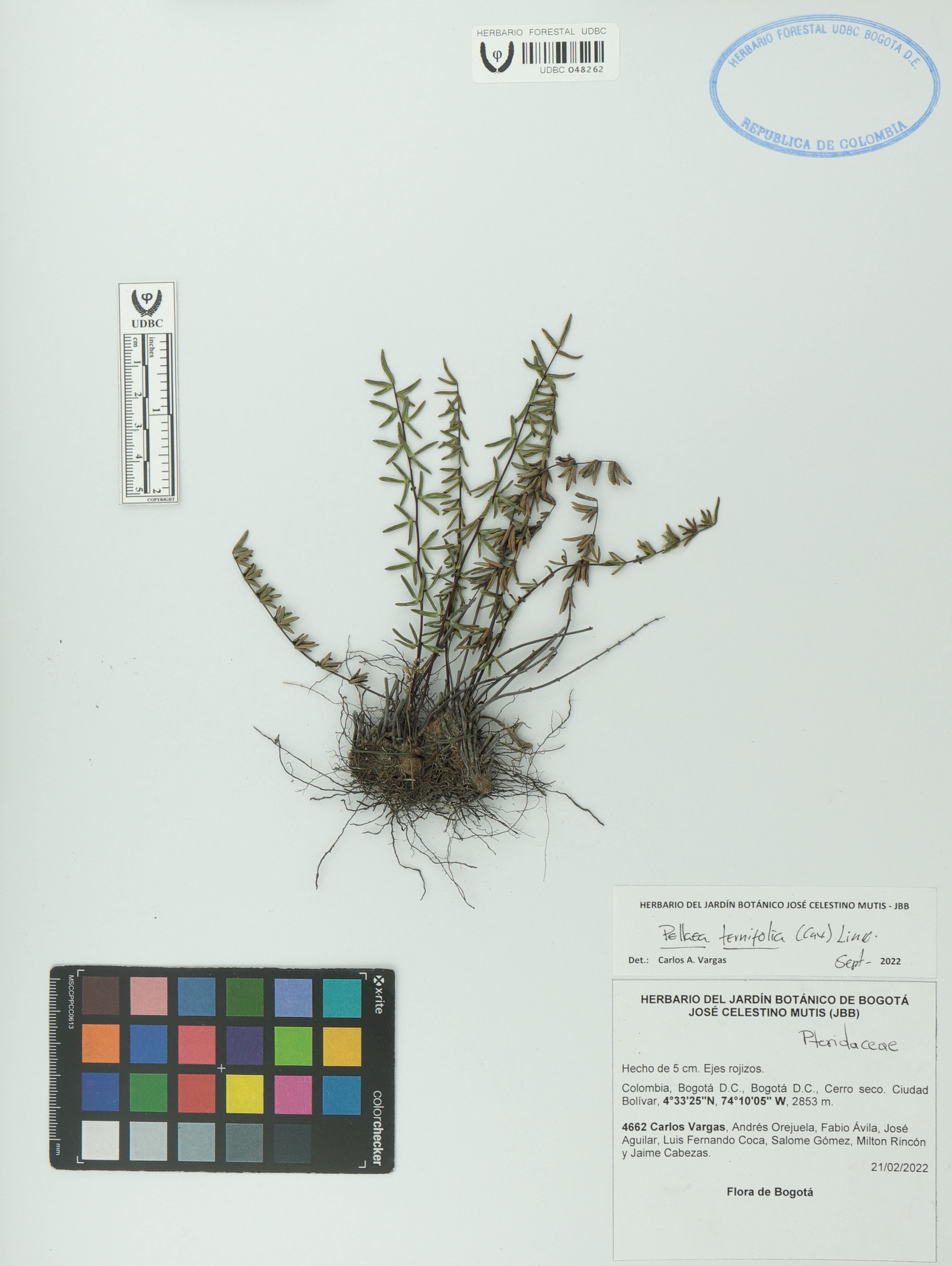 Fotografía del ejemplar Vargas, C. 4662, determinado como Pellaea ternifolia en el año 2022