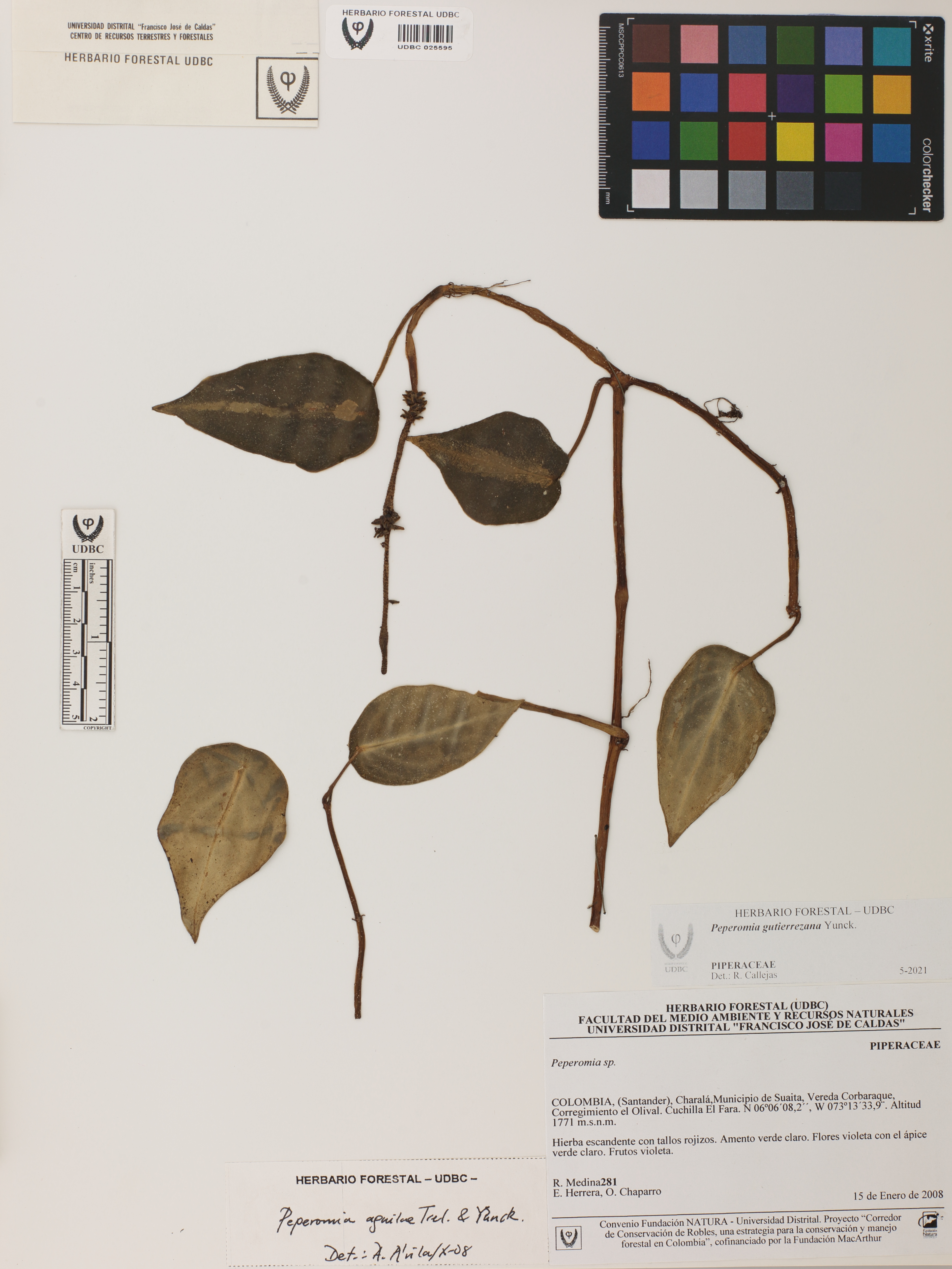 Fotografía del ejemplar Medina, R. 281, determinado como Peperomia gutierrezana en el año 2021