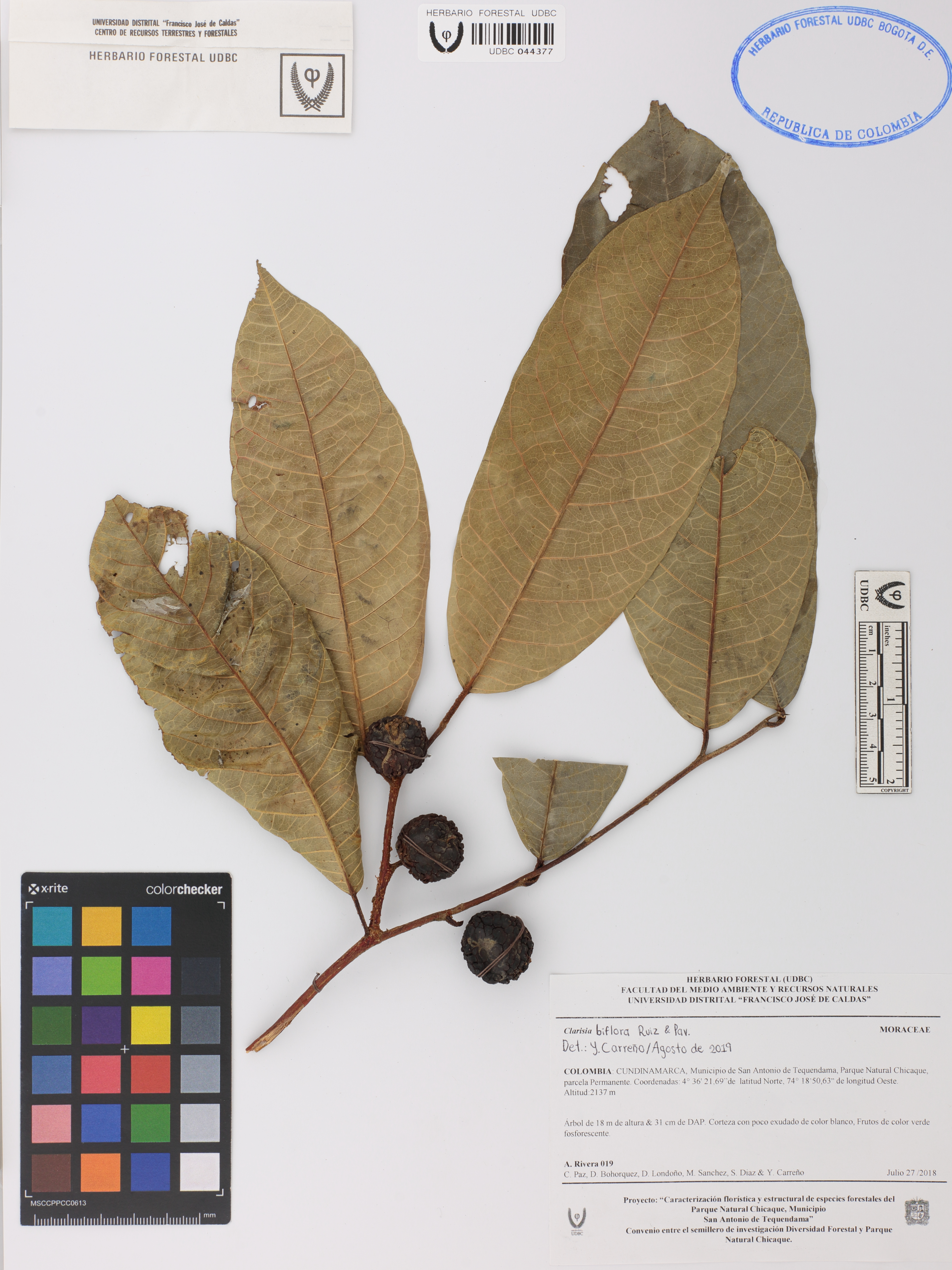 Fotografía del ejemplar Rivera, A. 19, determinado como Clarisia biflora en el año 2019