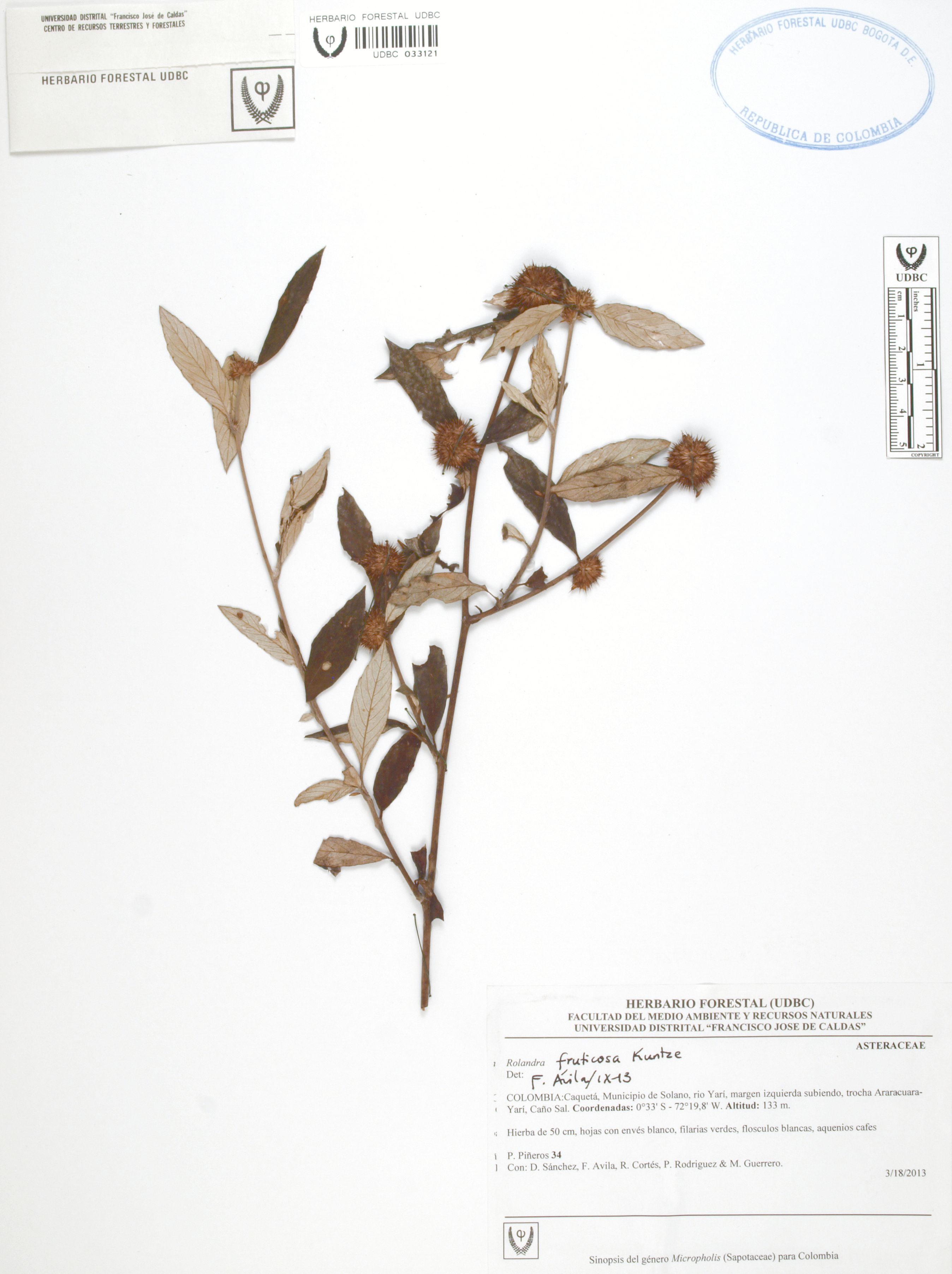 Fotografía del ejemplar Piñeros, P. 34, determinado como Rolandra fruticosa en el año 2013
