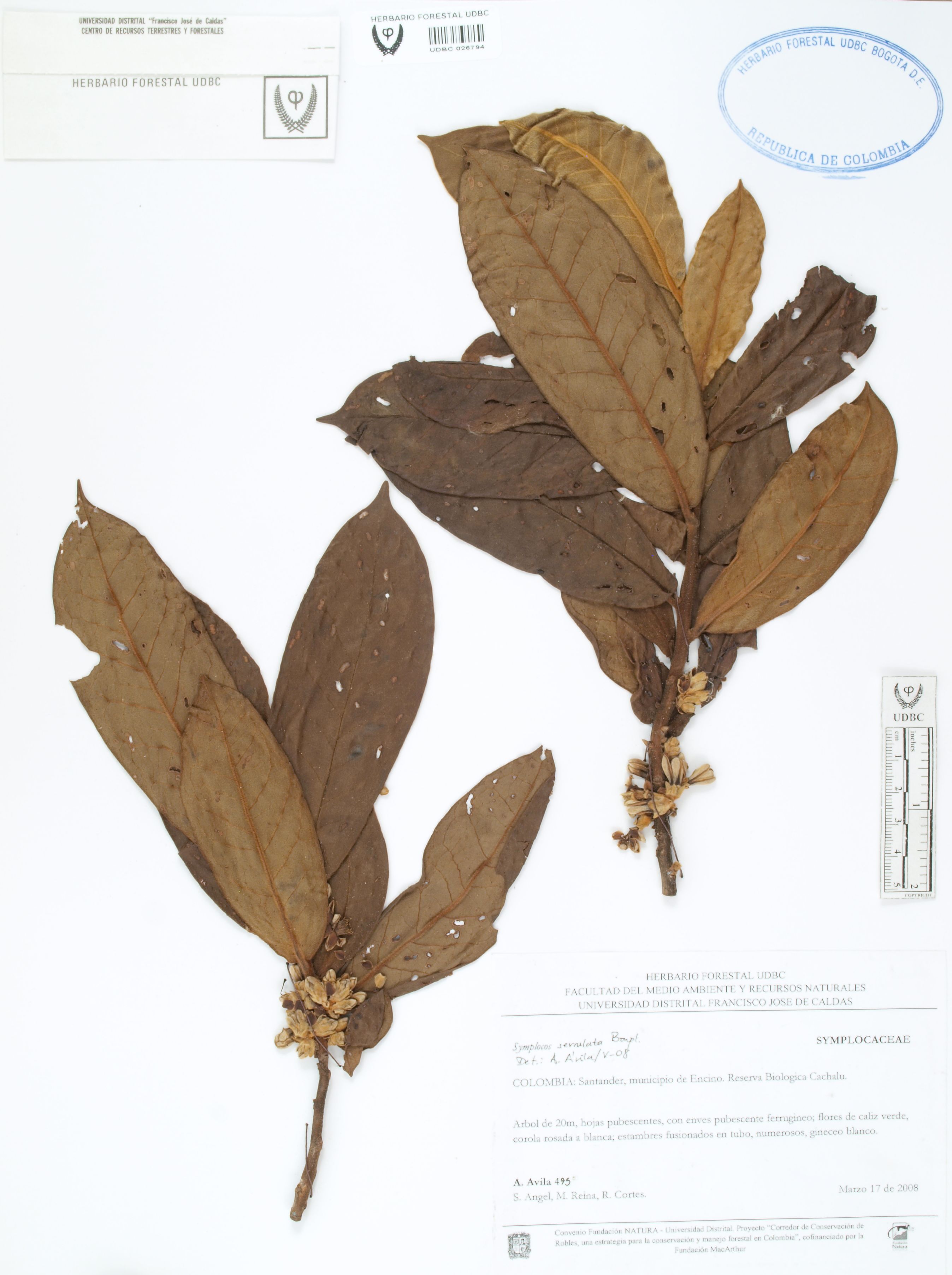 Fotografía del ejemplar Ávila, F. 495, determinado como Symplocos serrulata en el año 2008