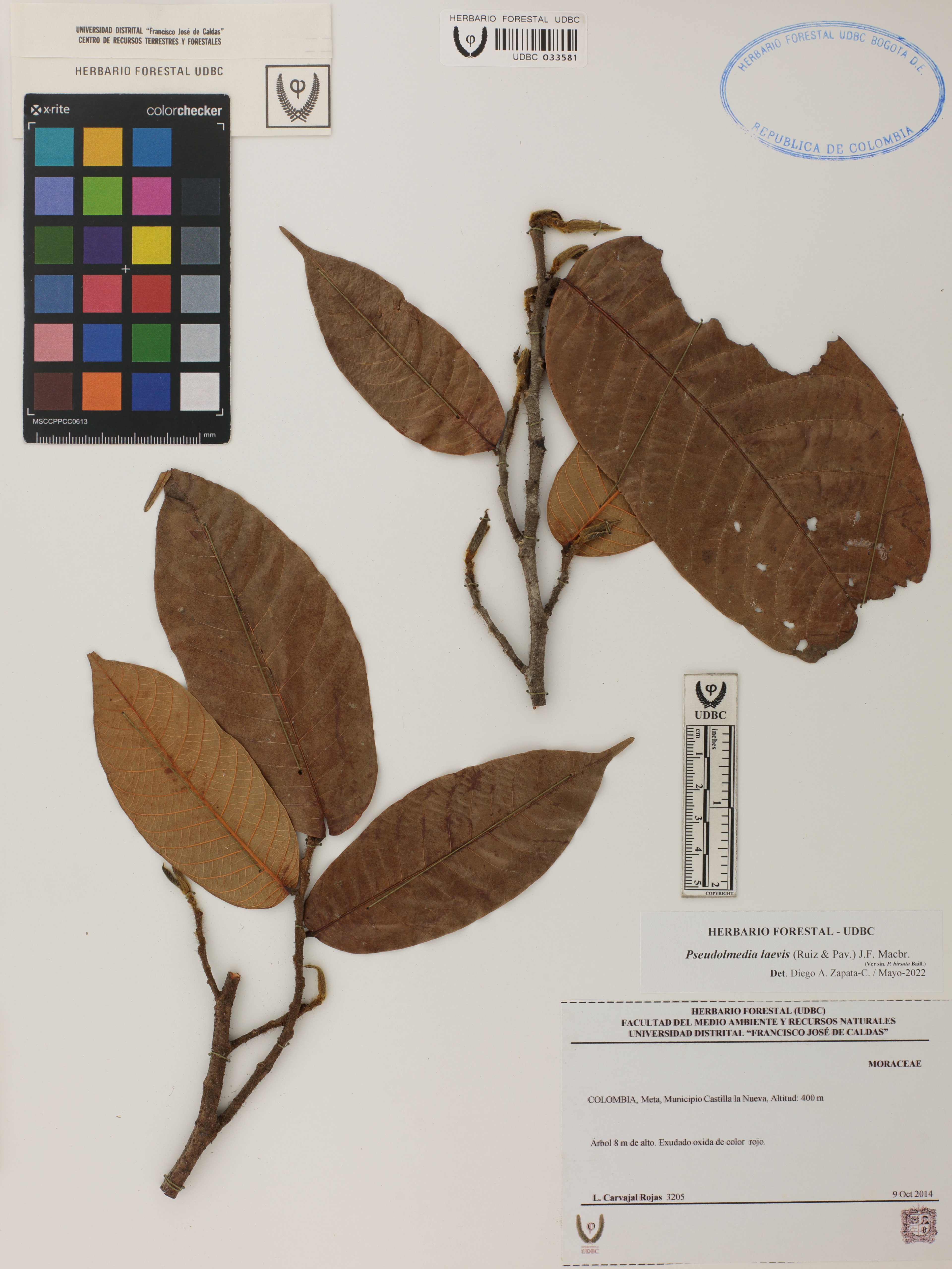 Fotografía del ejemplar Carvajal, L. 3205, determinado como Pseudolmedia laevis en el año 2022