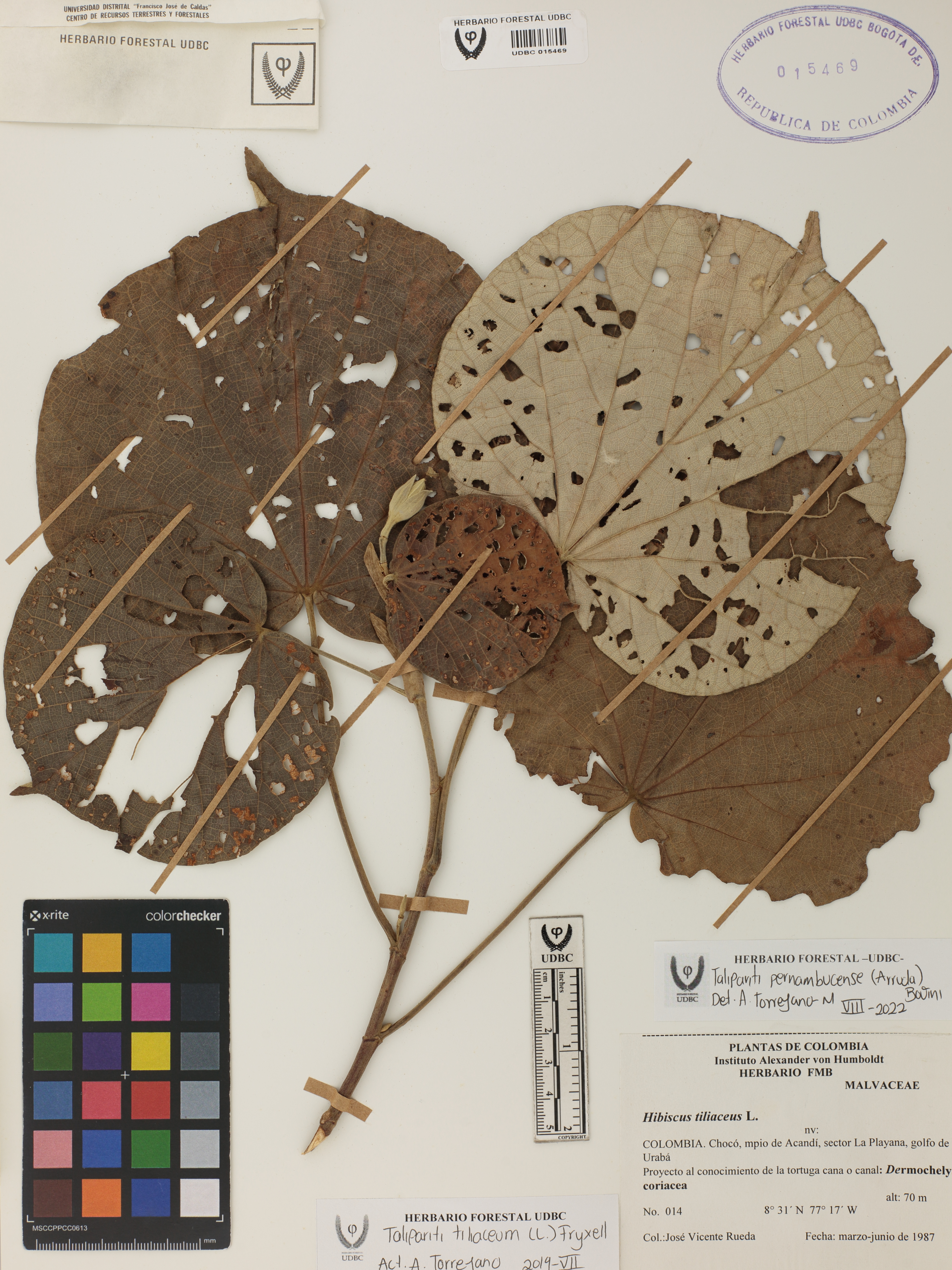 Fotografía del ejemplar Rueda, J. 14, determinado como Talipariti pernambucense en el año 2022