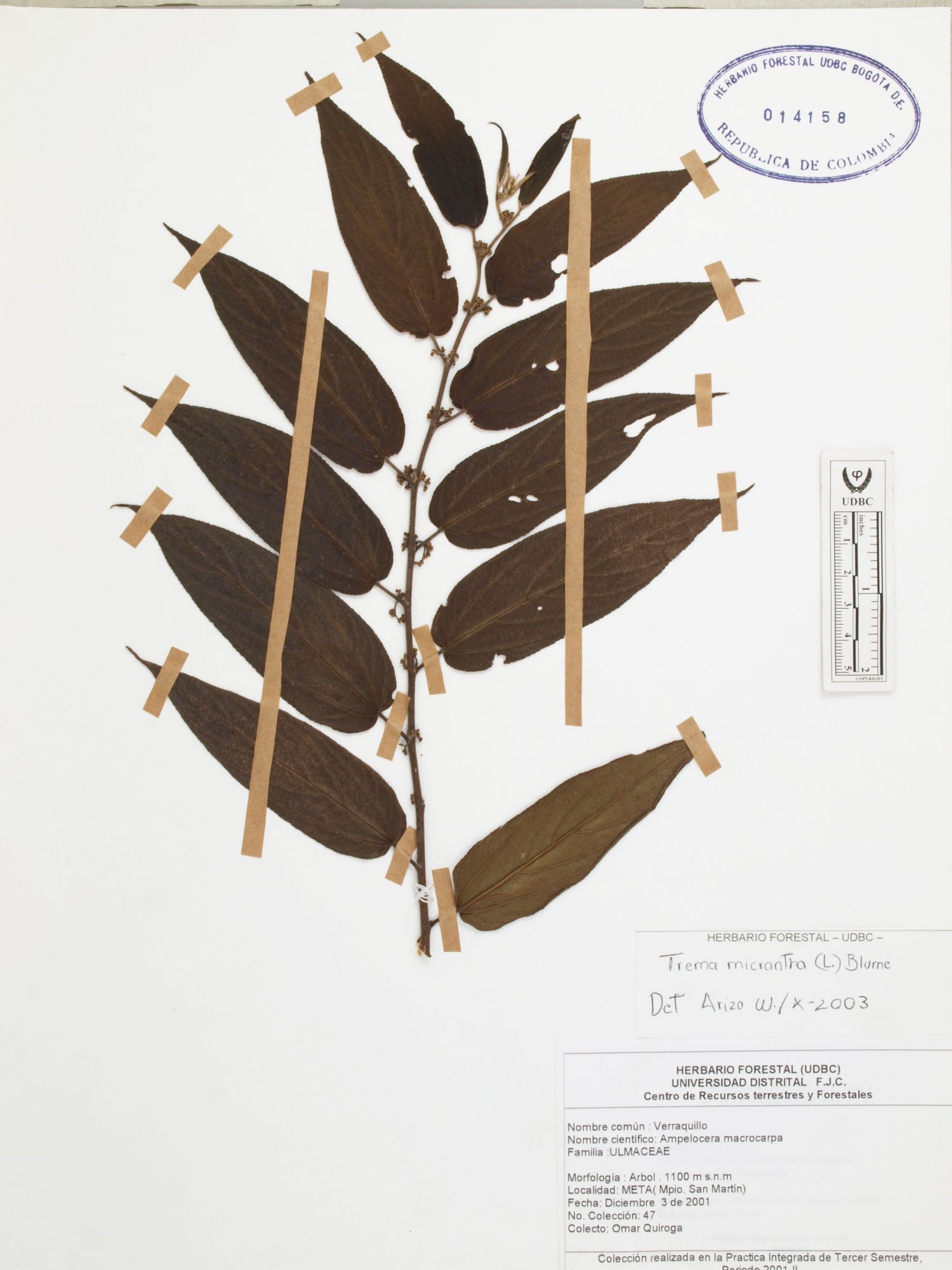 Fotografía del ejemplar Quiroga, O. 47, determinado como Trema micranthum en el año 2003