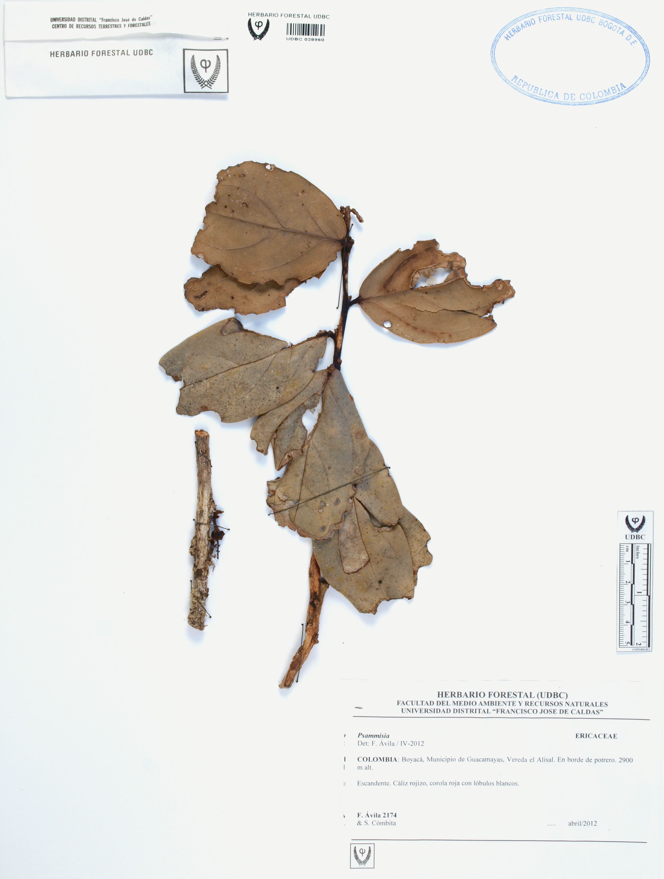Fotografía del ejemplar Ávila, F. 2174, determinado como Psammisia sp. en el año 2012