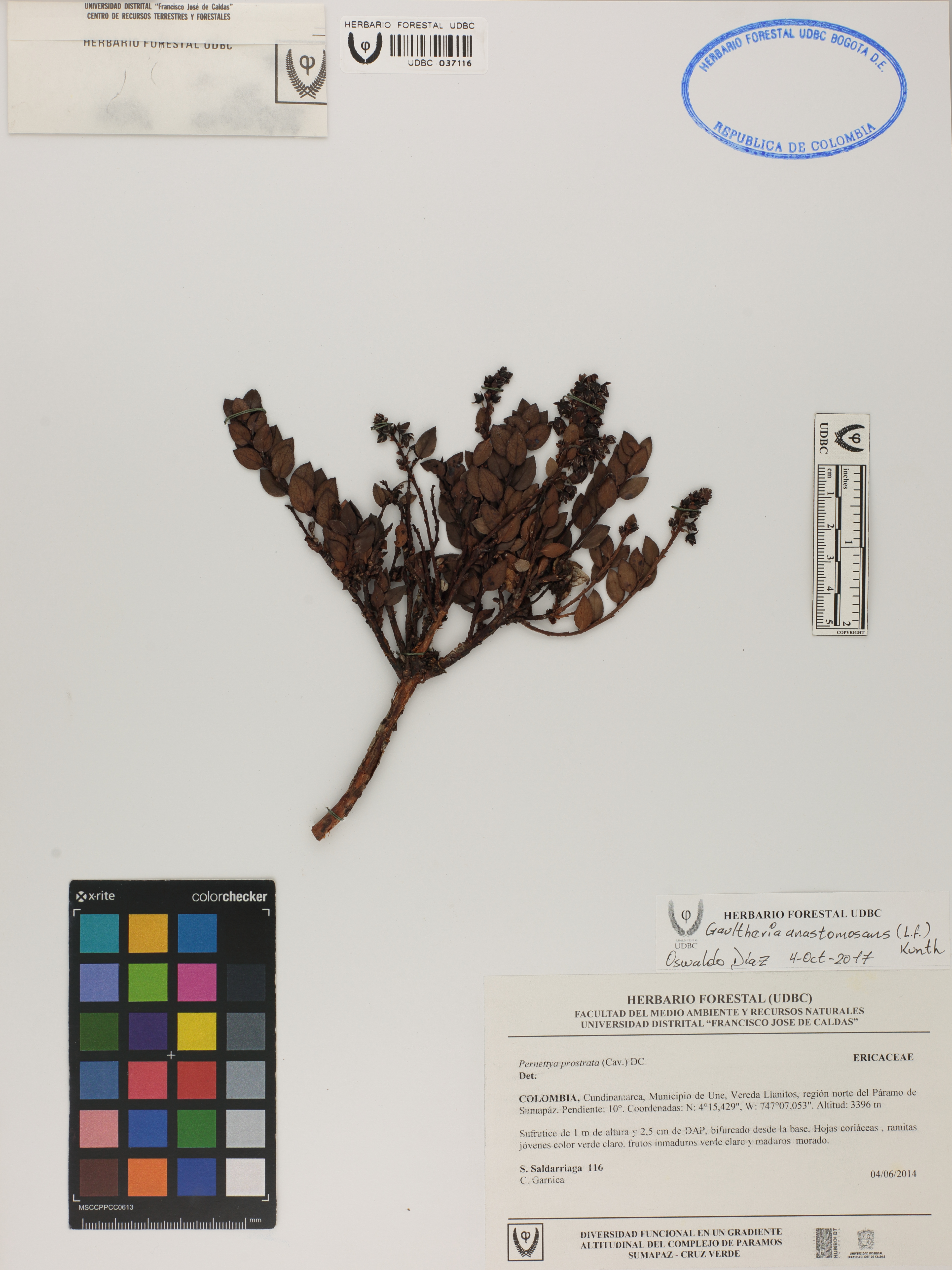 Fotografía del ejemplar Saldarriaga, S. 116, determinado como Gaultheria anastomosans en el año 2017