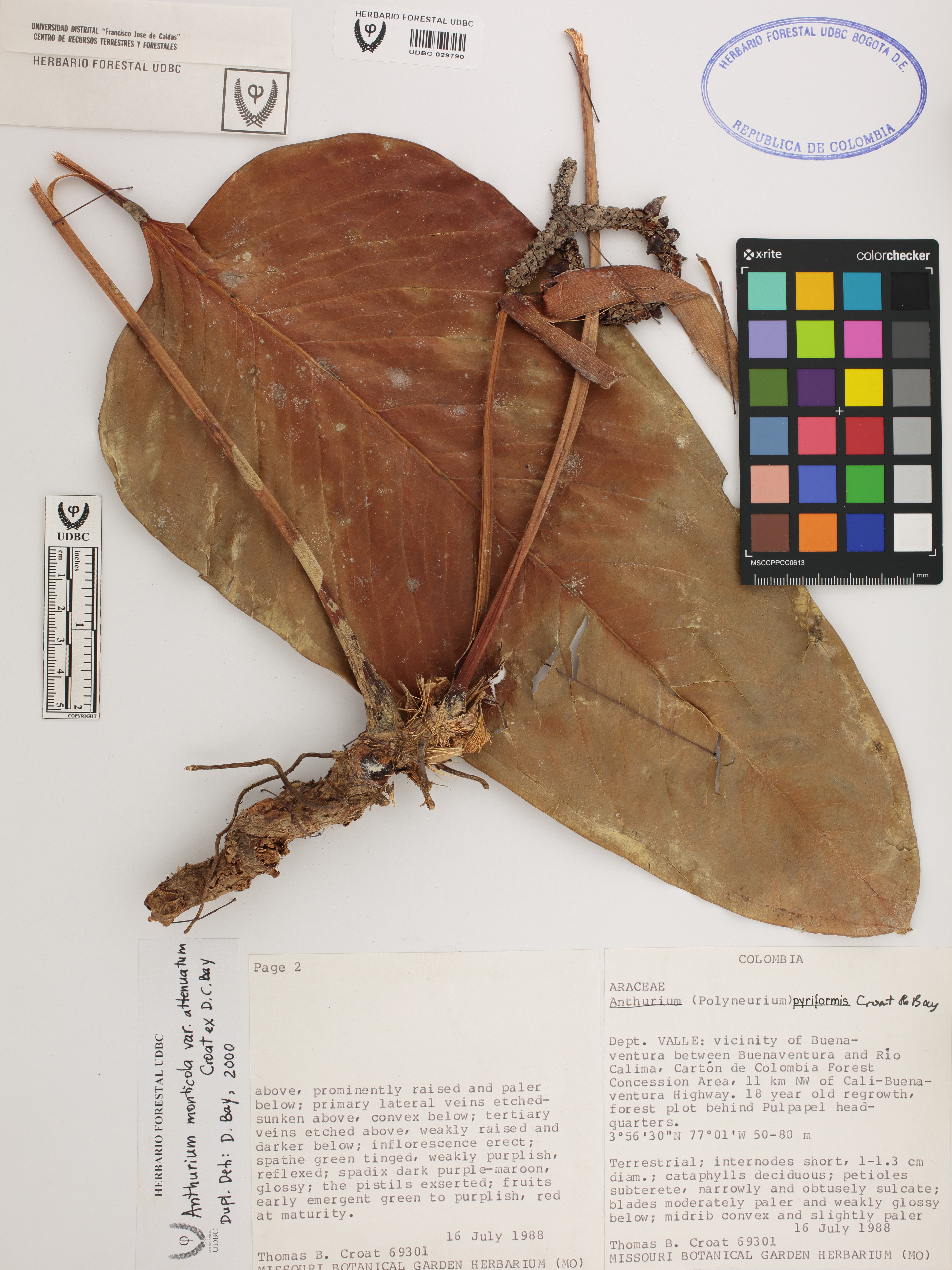 Fotografía del ejemplar Croat, T. 69301, determinado como Anthurium monticola var. attenuatum en el año 2000