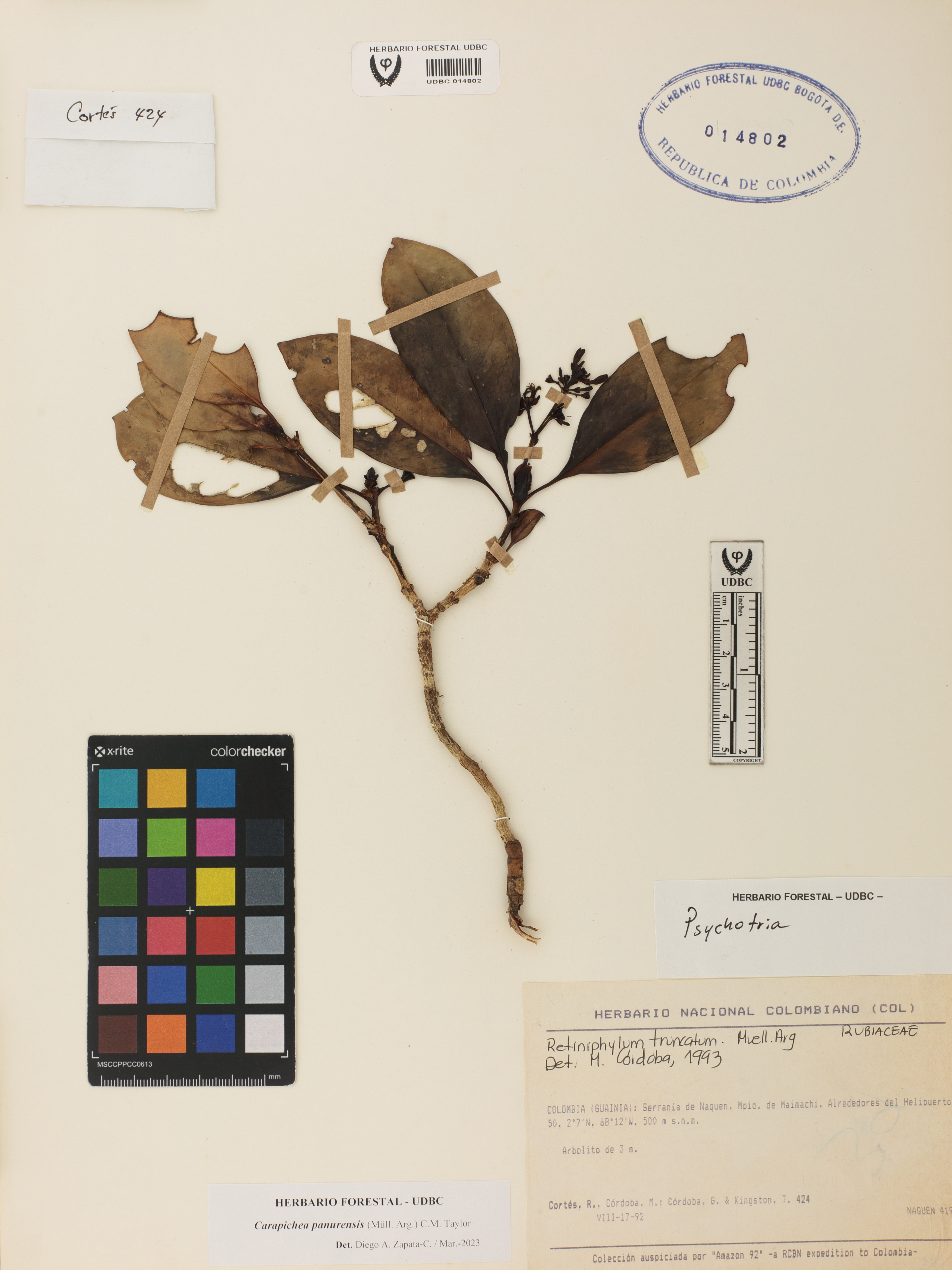 Fotografía del ejemplar Cortés-B., R. 424, determinado como Carapichea panurensis en el año 2023