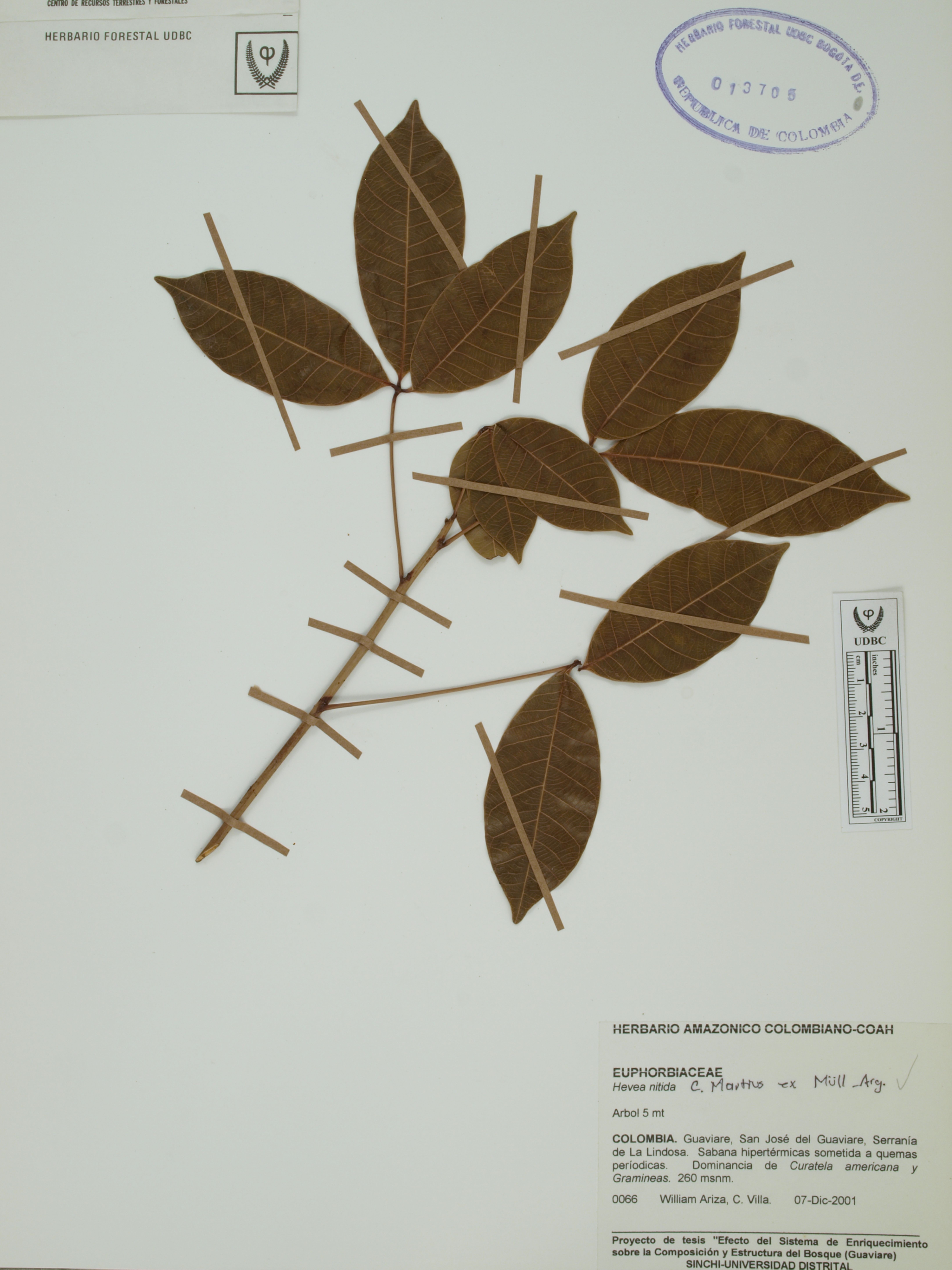 Fotografía del ejemplar Ariza, W. 66, determinado como Hevea nitida