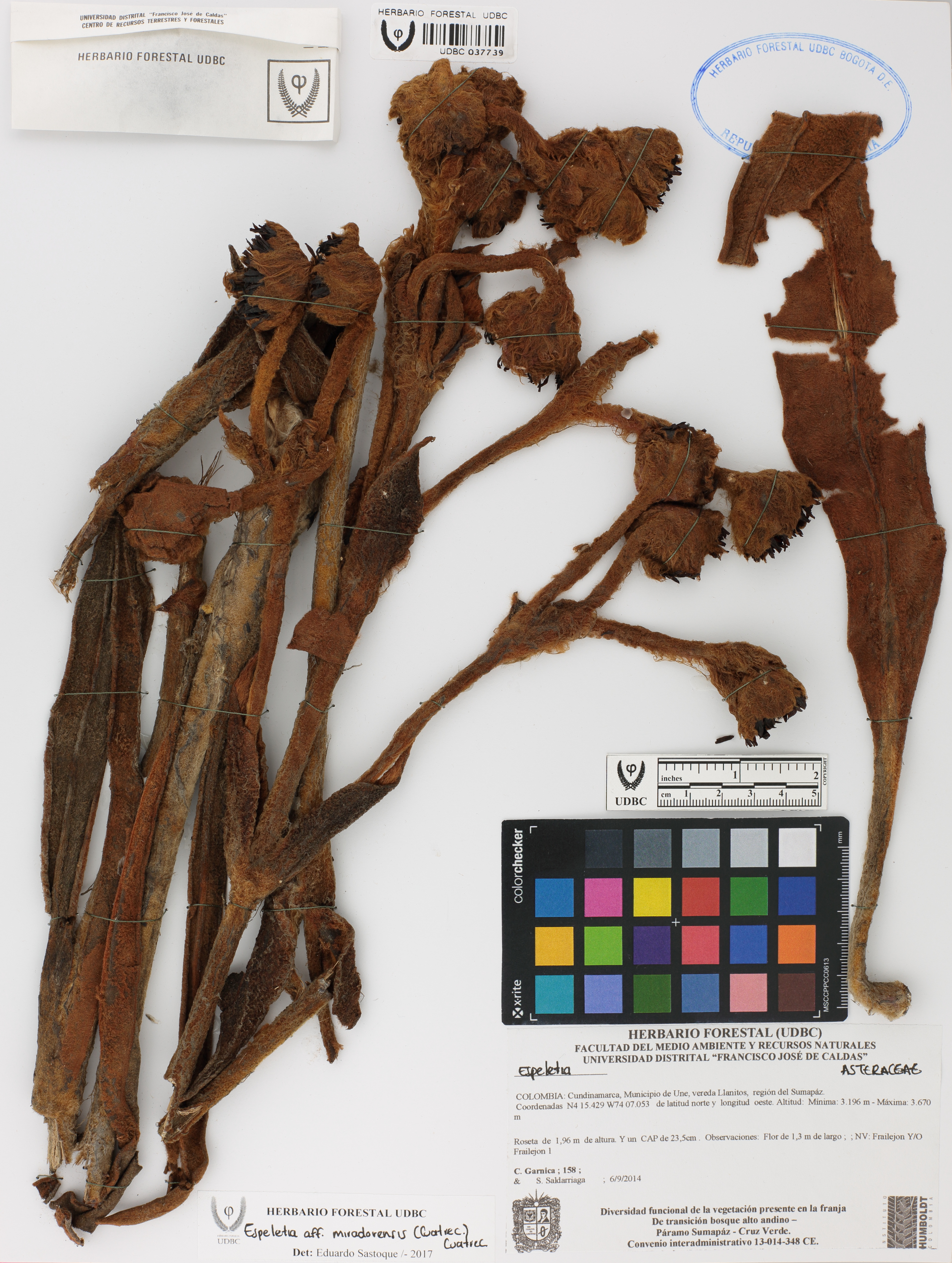Fotografía del ejemplar Garnica, C. 158, determinado como Espeletia miradorensis en el año 2017