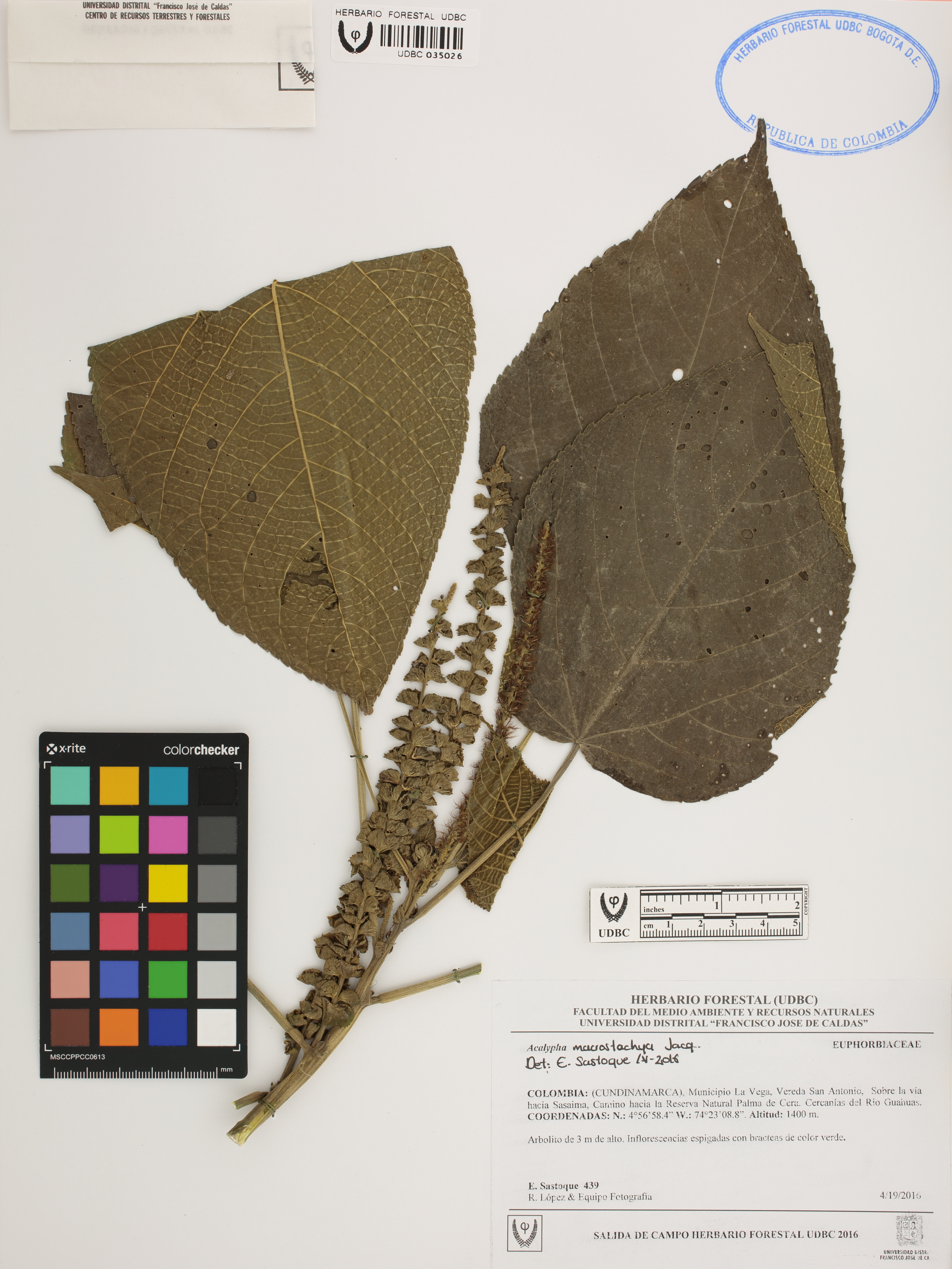 Fotografía del ejemplar Sastoque, E. 439, determinado como Acalypha macrostachya en el año 2016