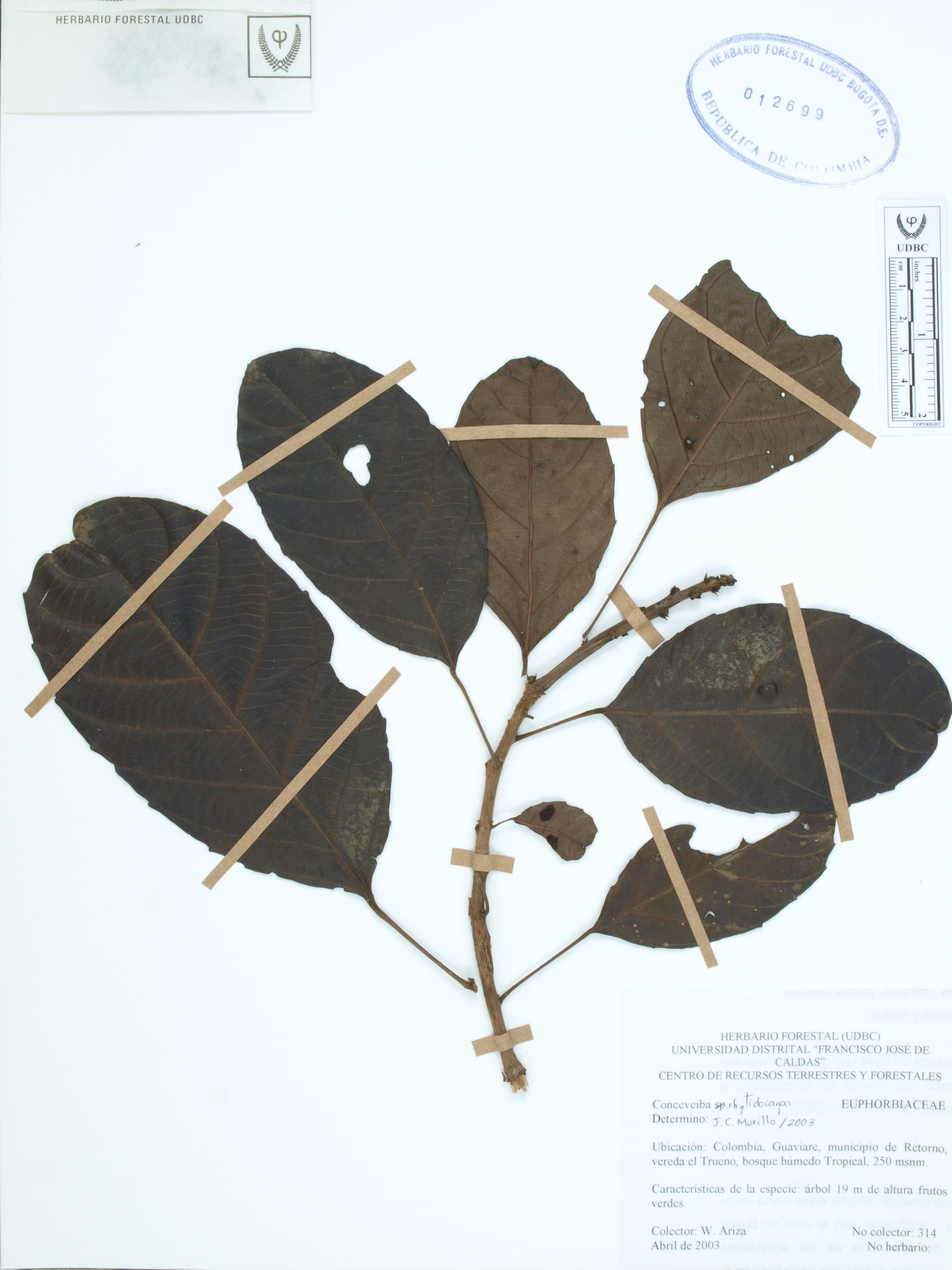 Fotografía del ejemplar Ariza, W. 314, determinado como Conceveiba rhytidocarpa en el año 2003