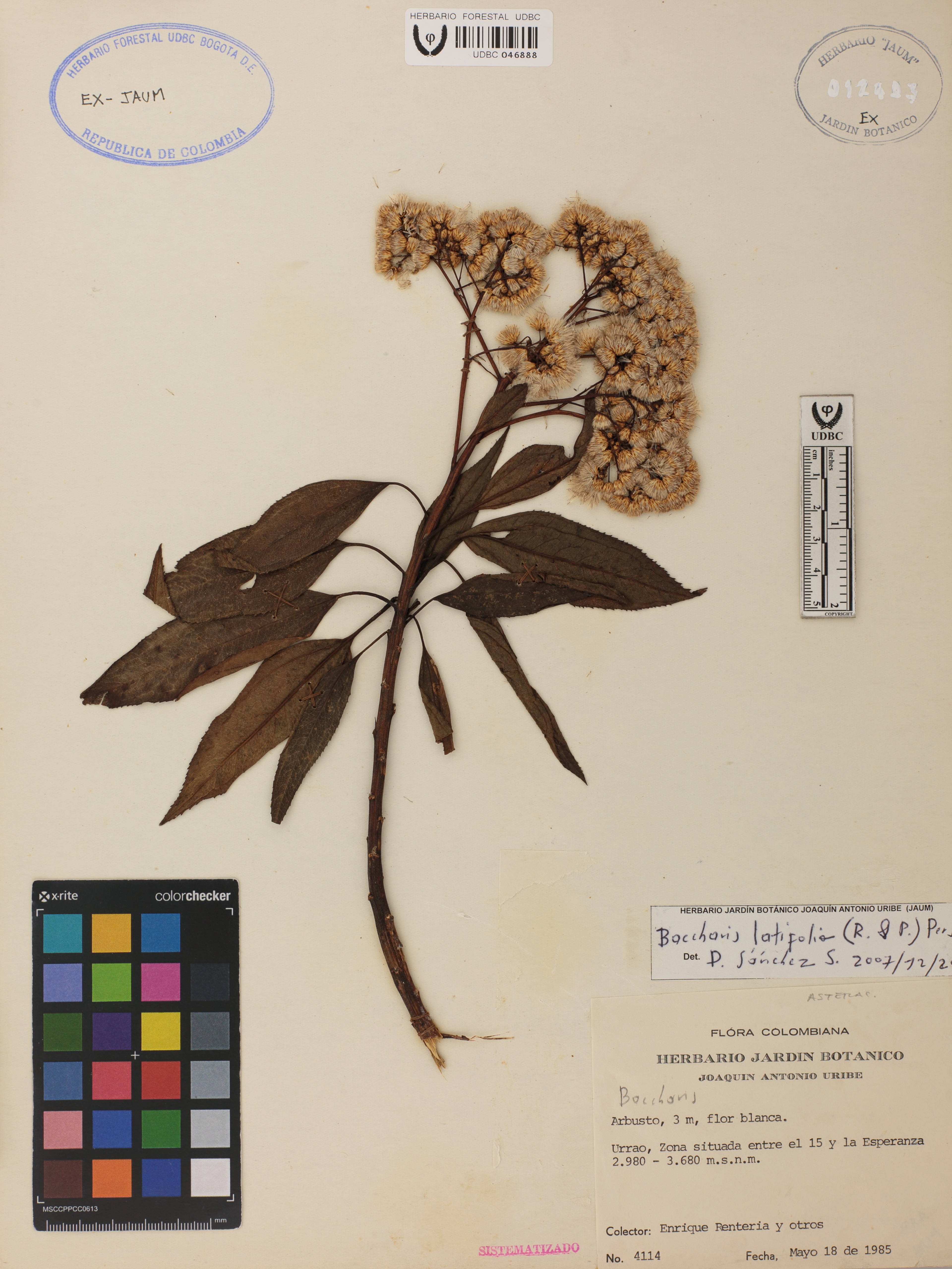 Fotografía del ejemplar Rentería, E. 4114, determinado como Baccharis latifolia en el año 2007