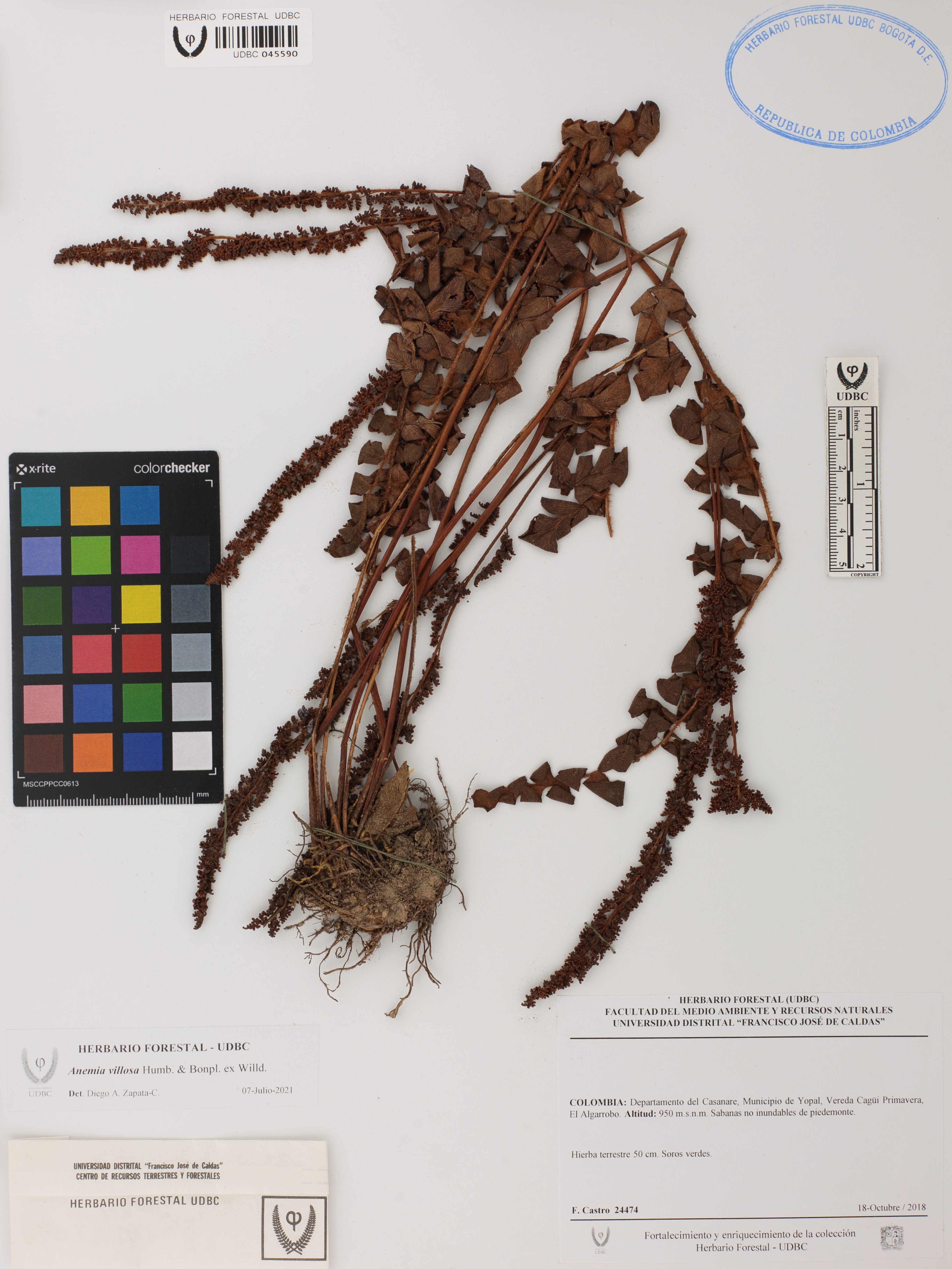 Fotografía del ejemplar Castro, F. 24474, determinado como Anemia villosa en el año 2021