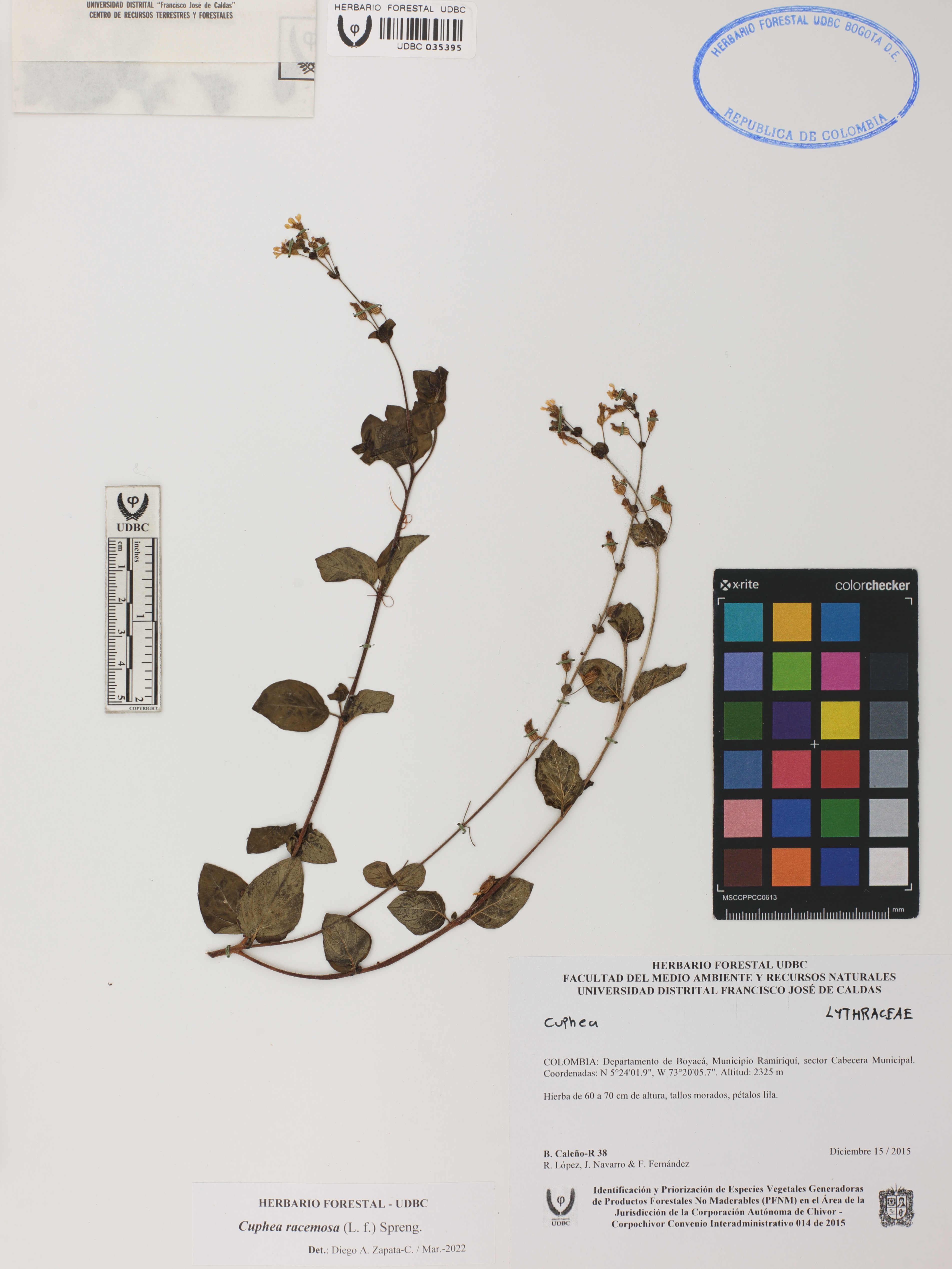 Fotografía del ejemplar Caleño-R., B. 38, determinado como Cuphea racemosa en el año 2022