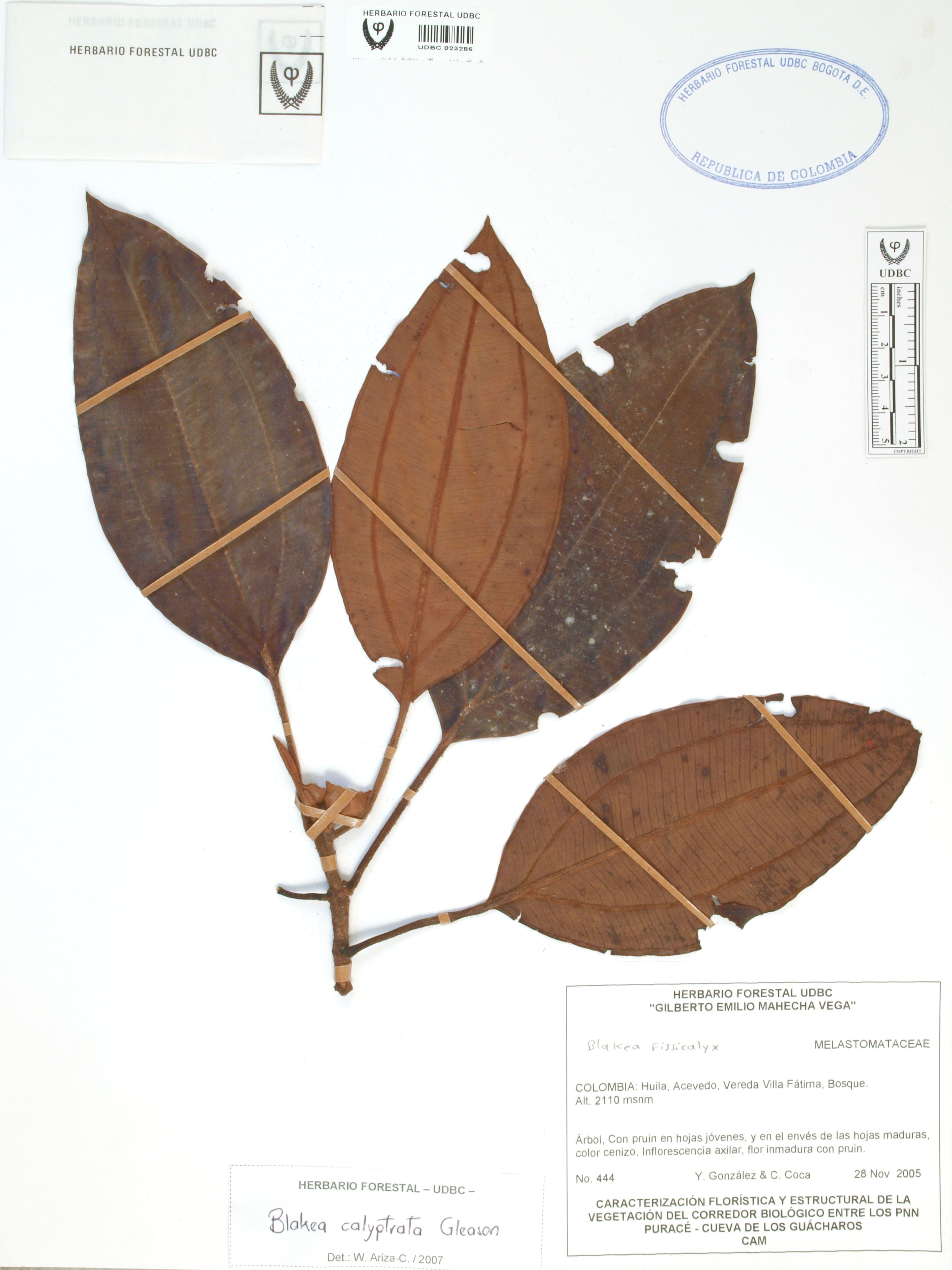 Fotografía del ejemplar González, Y. 444, determinado como Blakea calyptrata en el año 2007