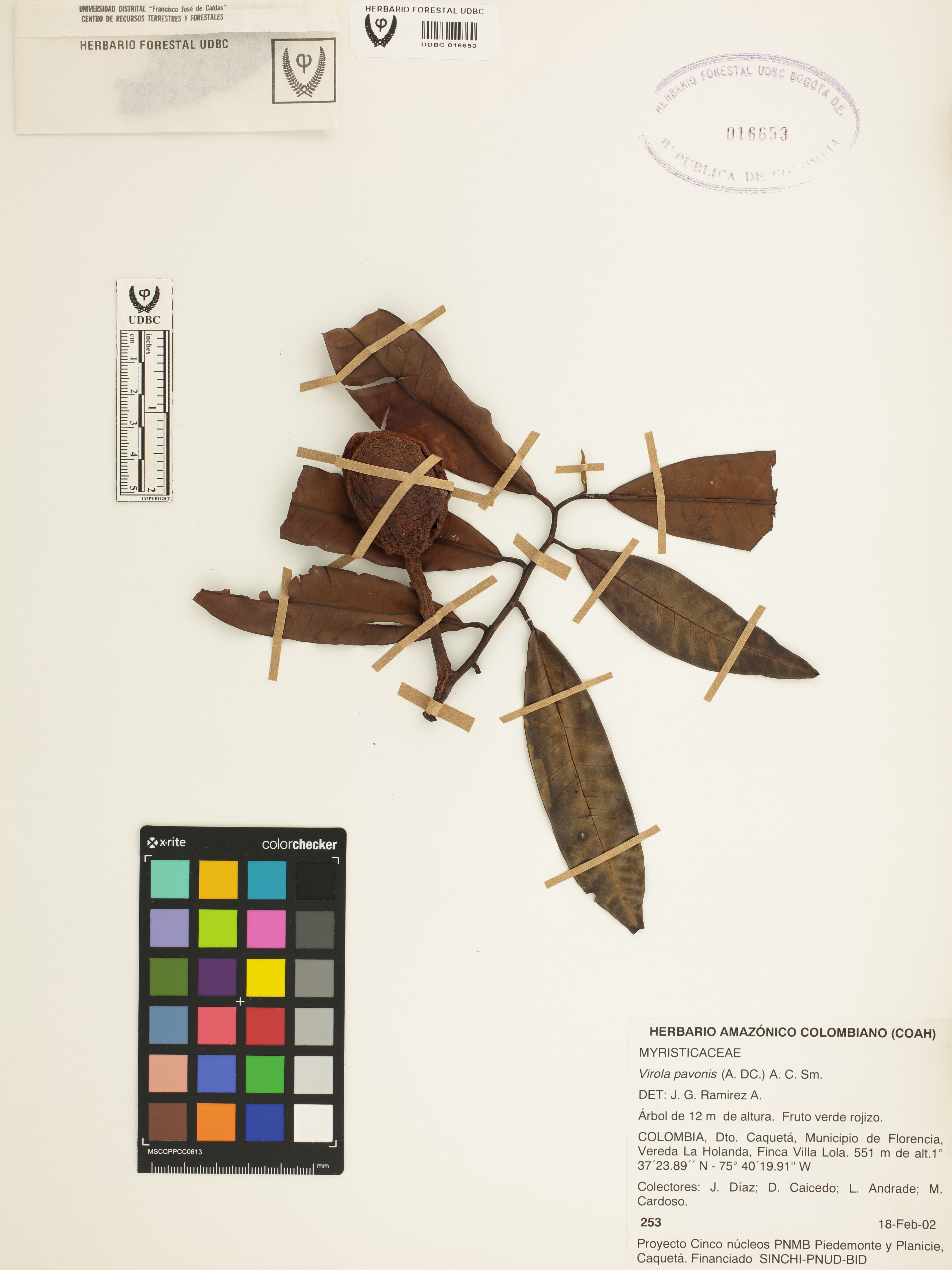 Fotografía del ejemplar Díaz, J. 253, determinado como Virola pavonis