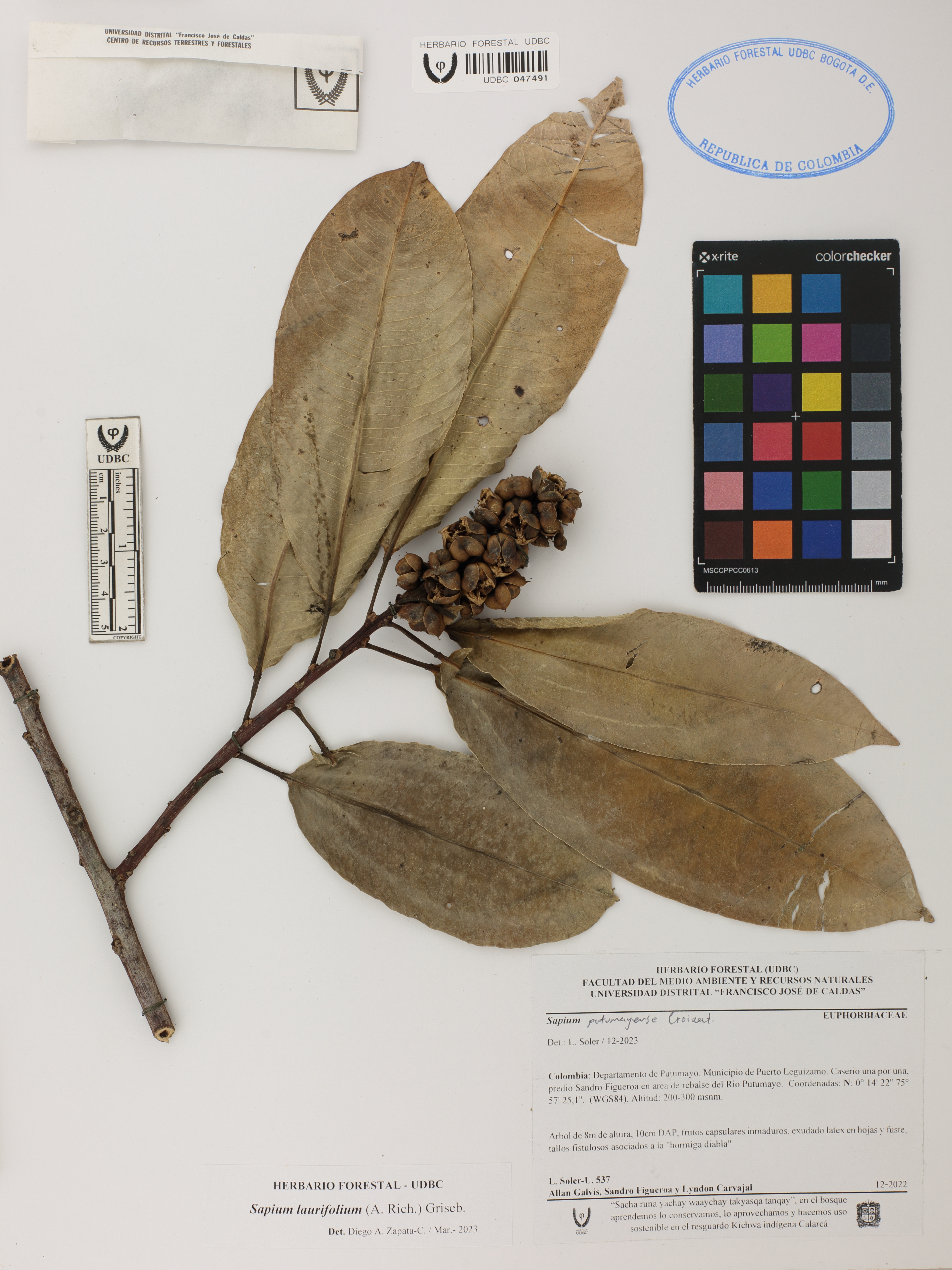 Fotografía del ejemplar Soler, L. 537, determinado como Sapium laurifolium en el año 2023