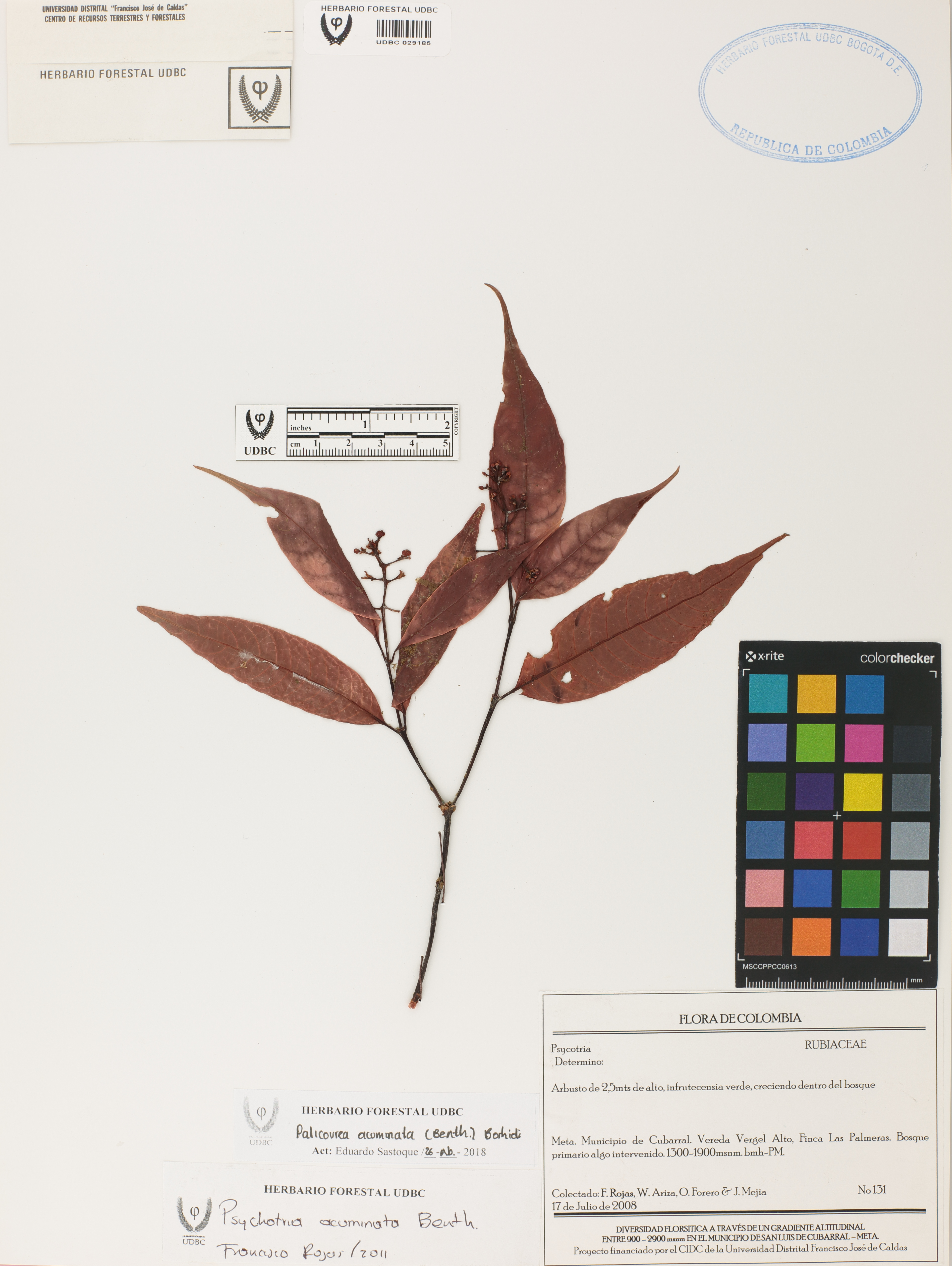 Fotografía del ejemplar Rojas, F. 131, determinado como Palicourea acuminata en el año 2011