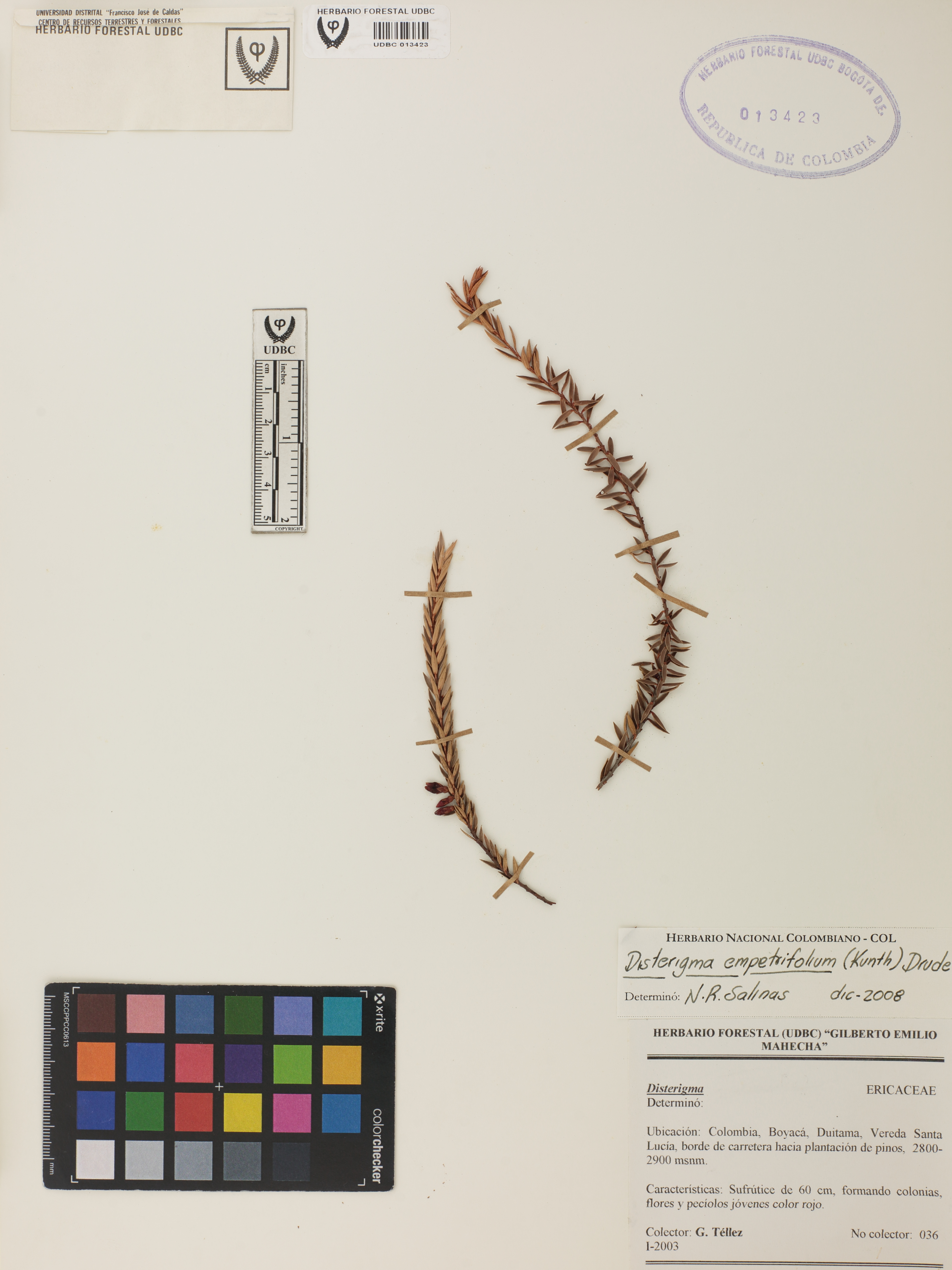 Fotografía del ejemplar Téllez, G. 36, determinado como Disterigma empetrifolium en el año 2008
