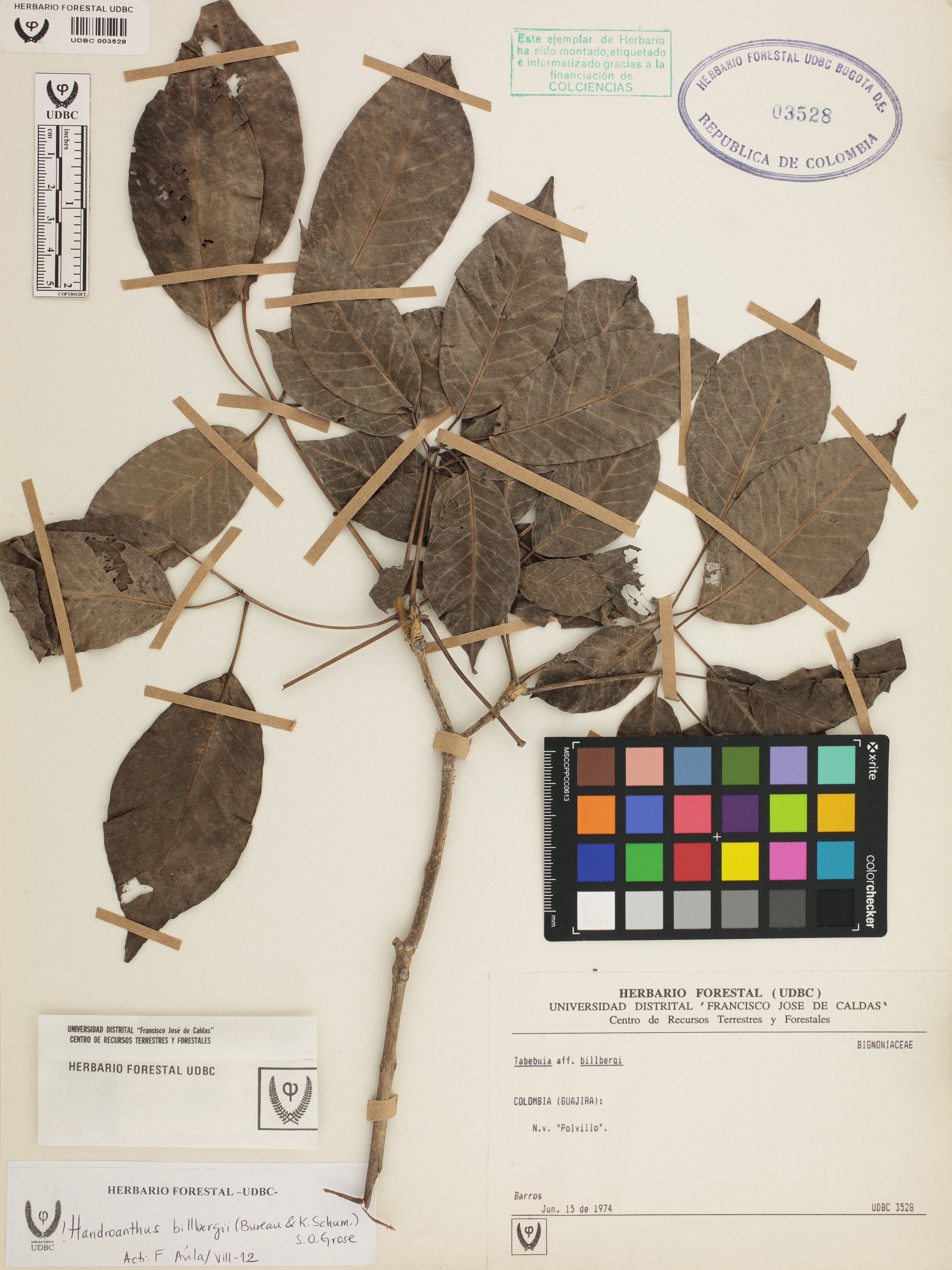 Fotografía del ejemplar Barros,, determinado como Handroanthus billbergii en el año 2012