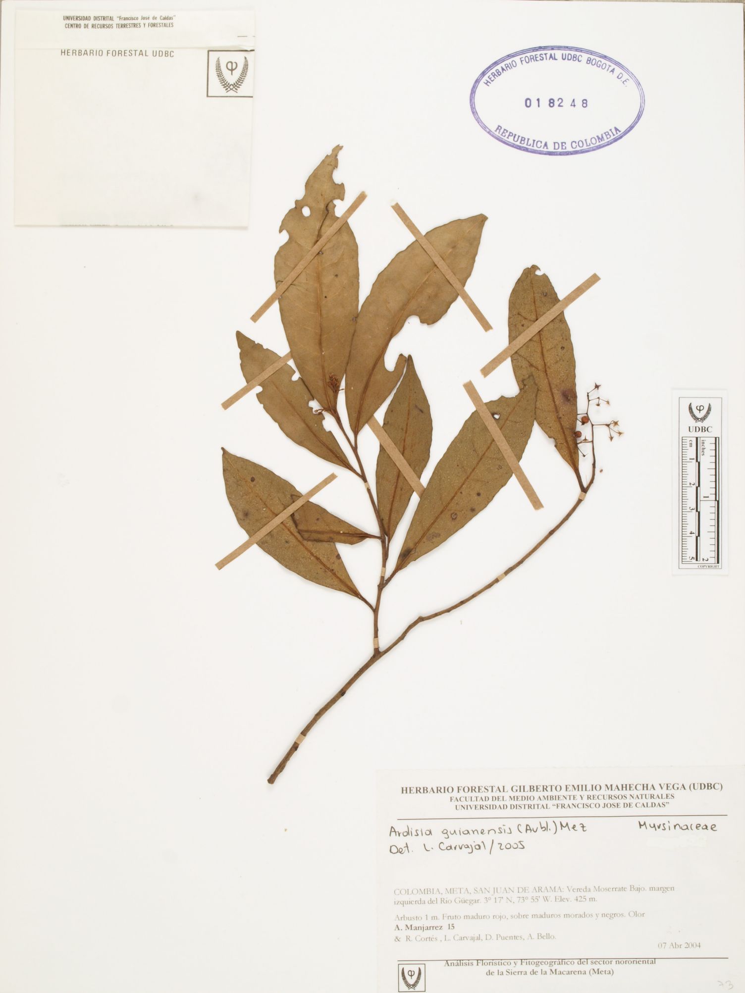 Fotografía del ejemplar Manjarrez, A. 15, determinado como Ardisia guianensis en el año 2005