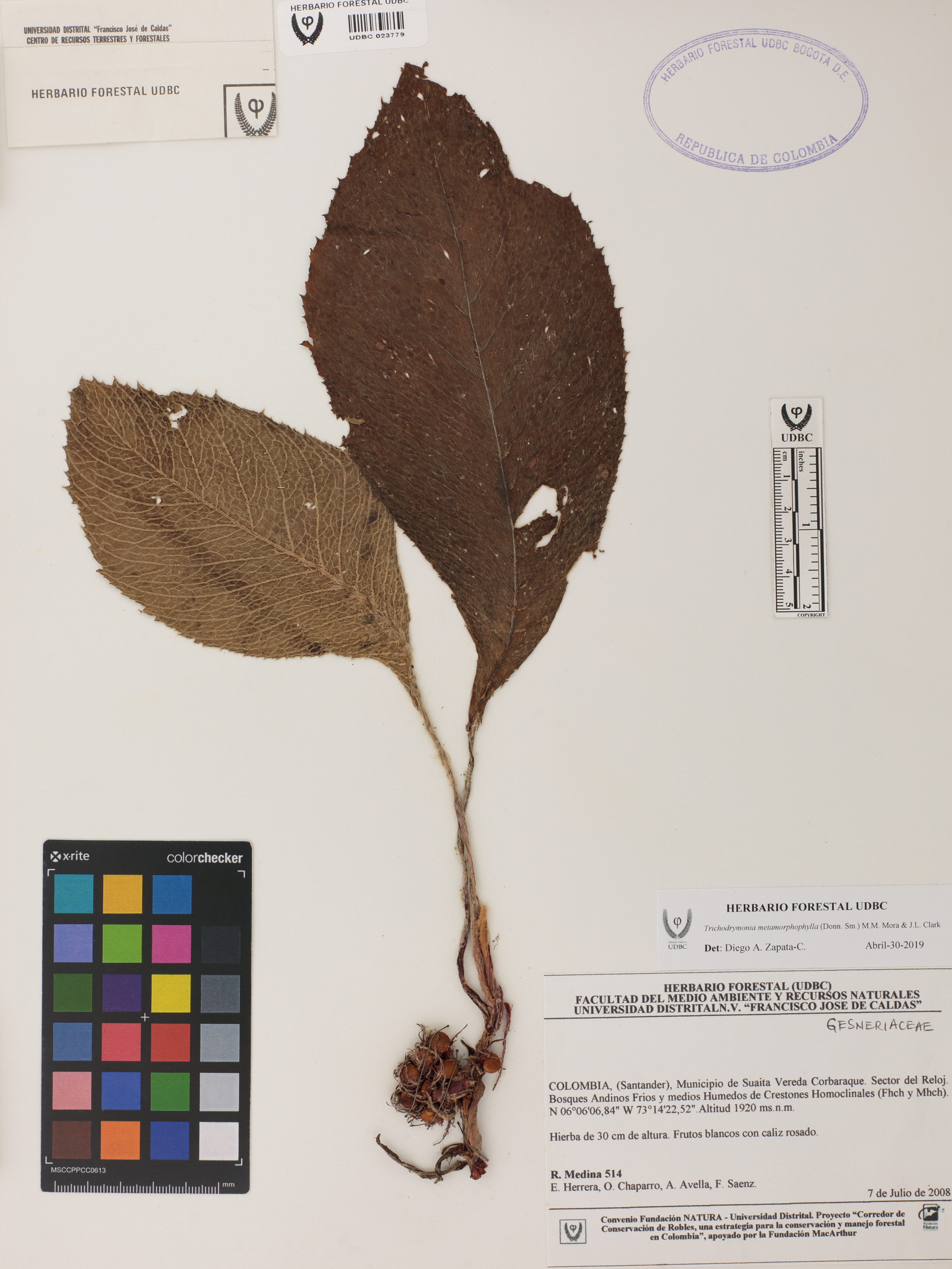 Fotografía del ejemplar Medina, R. 514, determinado como Trichodrymonia metamorphophylla en el año 2019