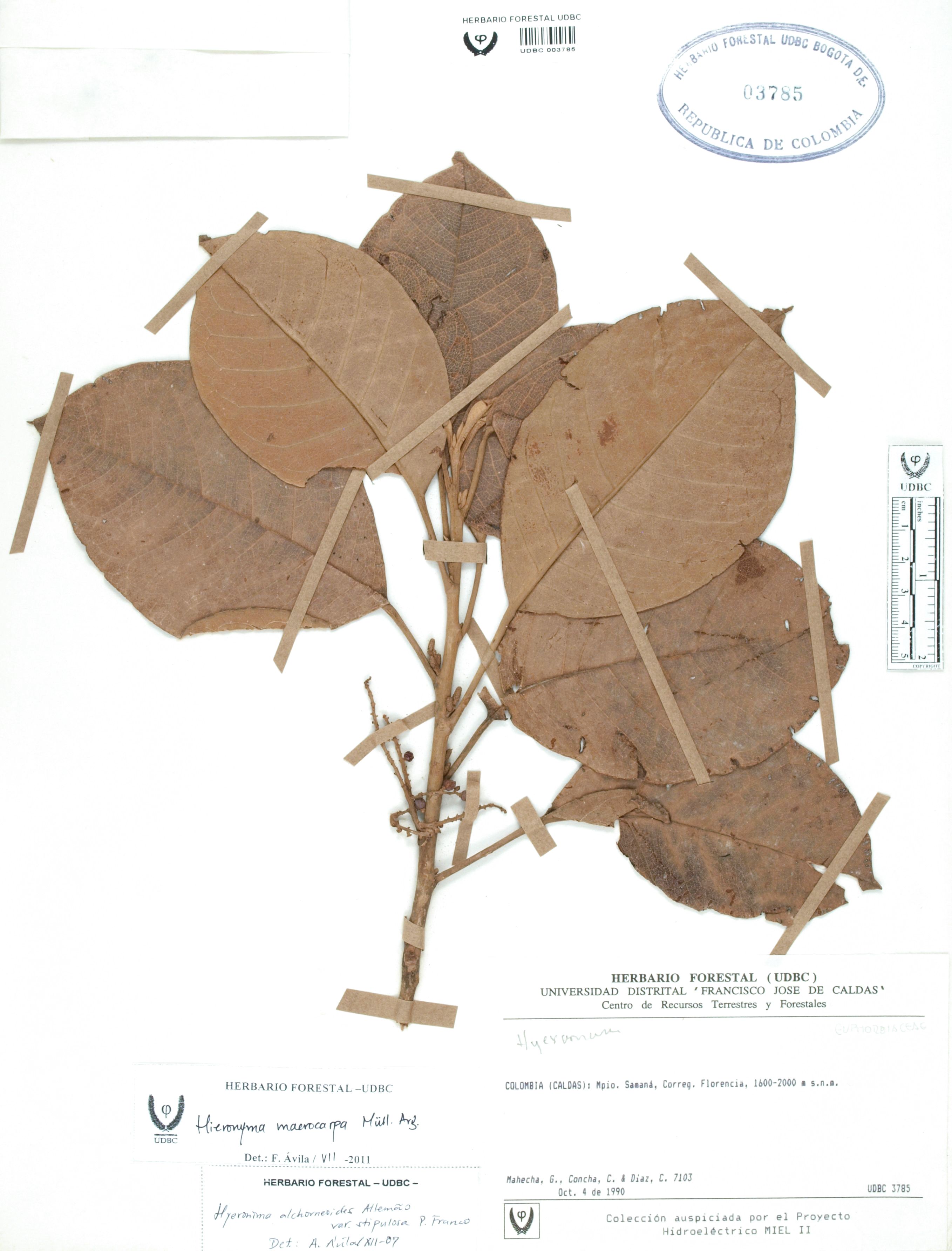 | dc.description | Fotografía del ejemplar Mahecha, G. 7103, determinado como Hieronyma macrocarpa en el año 2011 | |