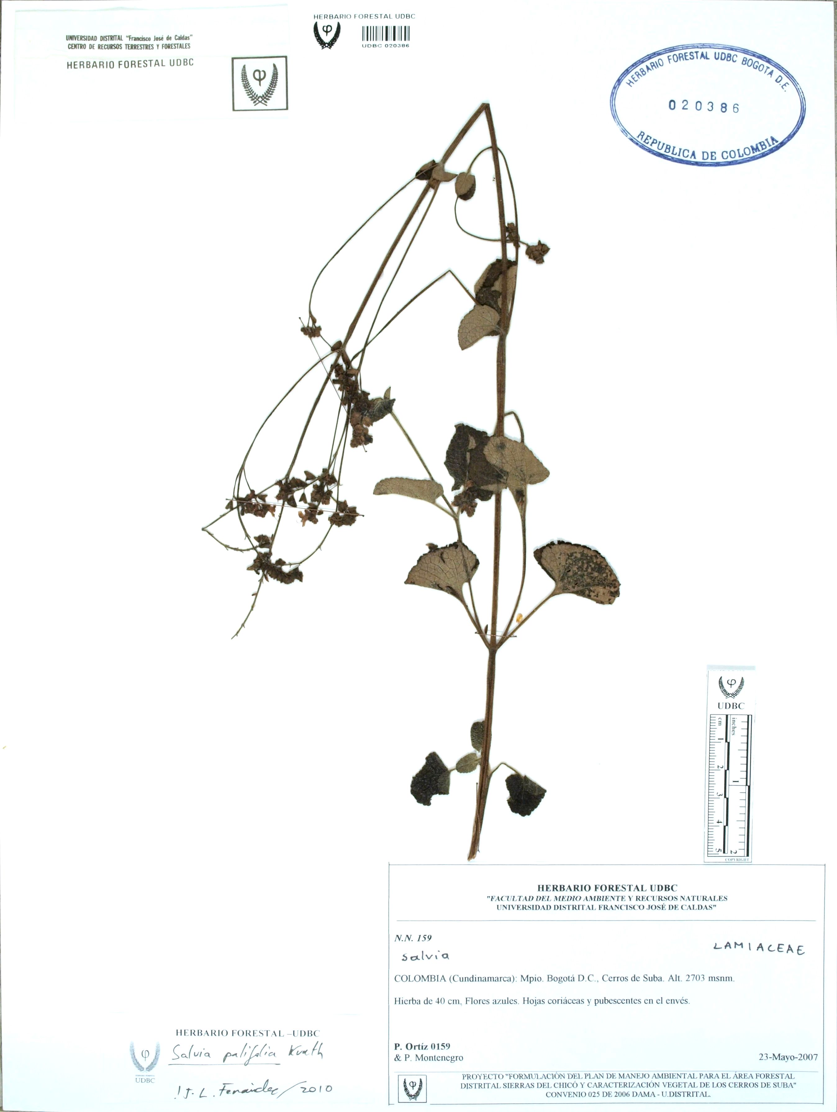 Fotografía del ejemplar Ortiz, P. 159, determinado como Salvia palifolia en el año 2010