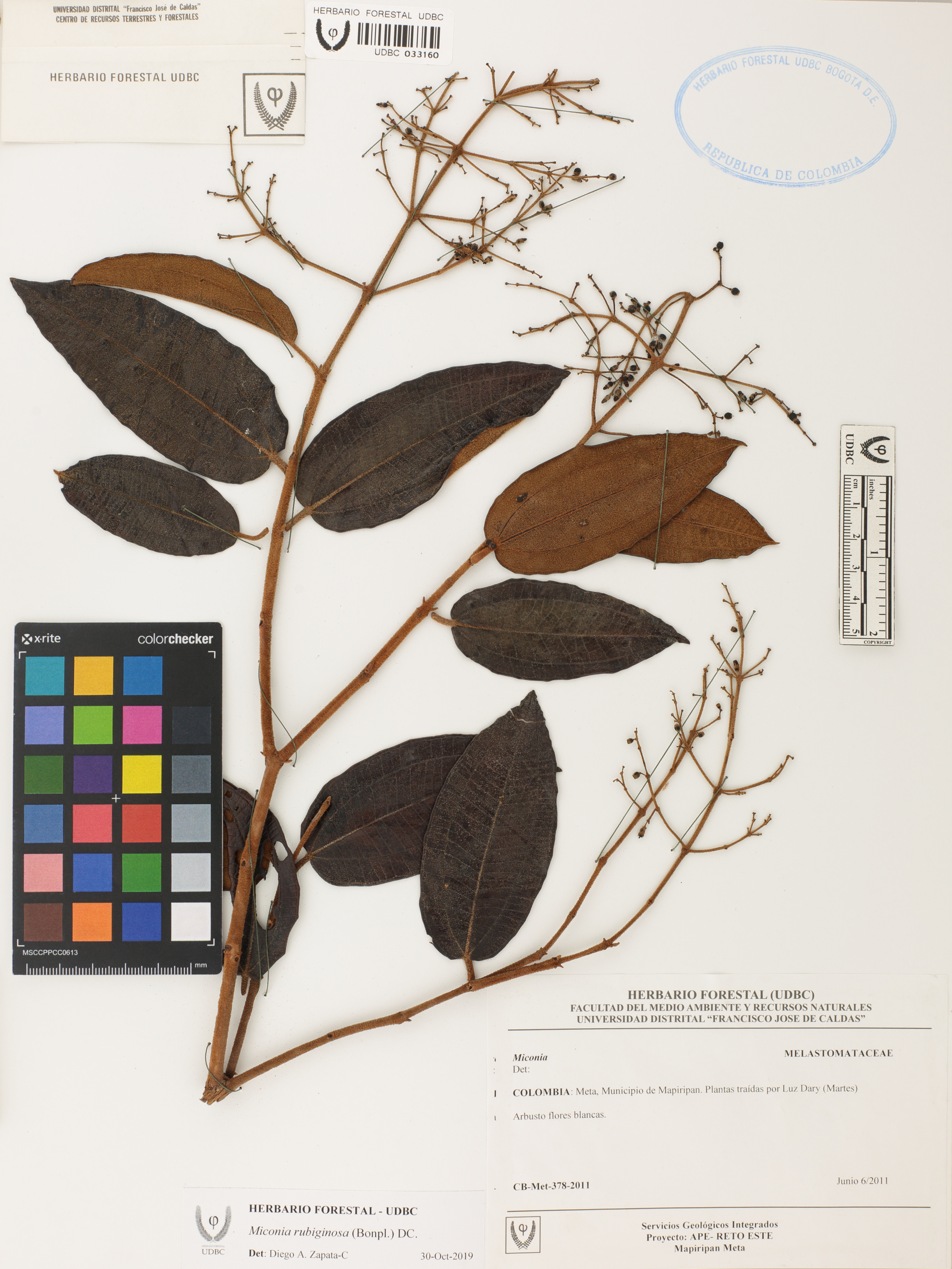 Fotografía del ejemplar SD 378, determinado como Miconia rubiginosa en el año 2019