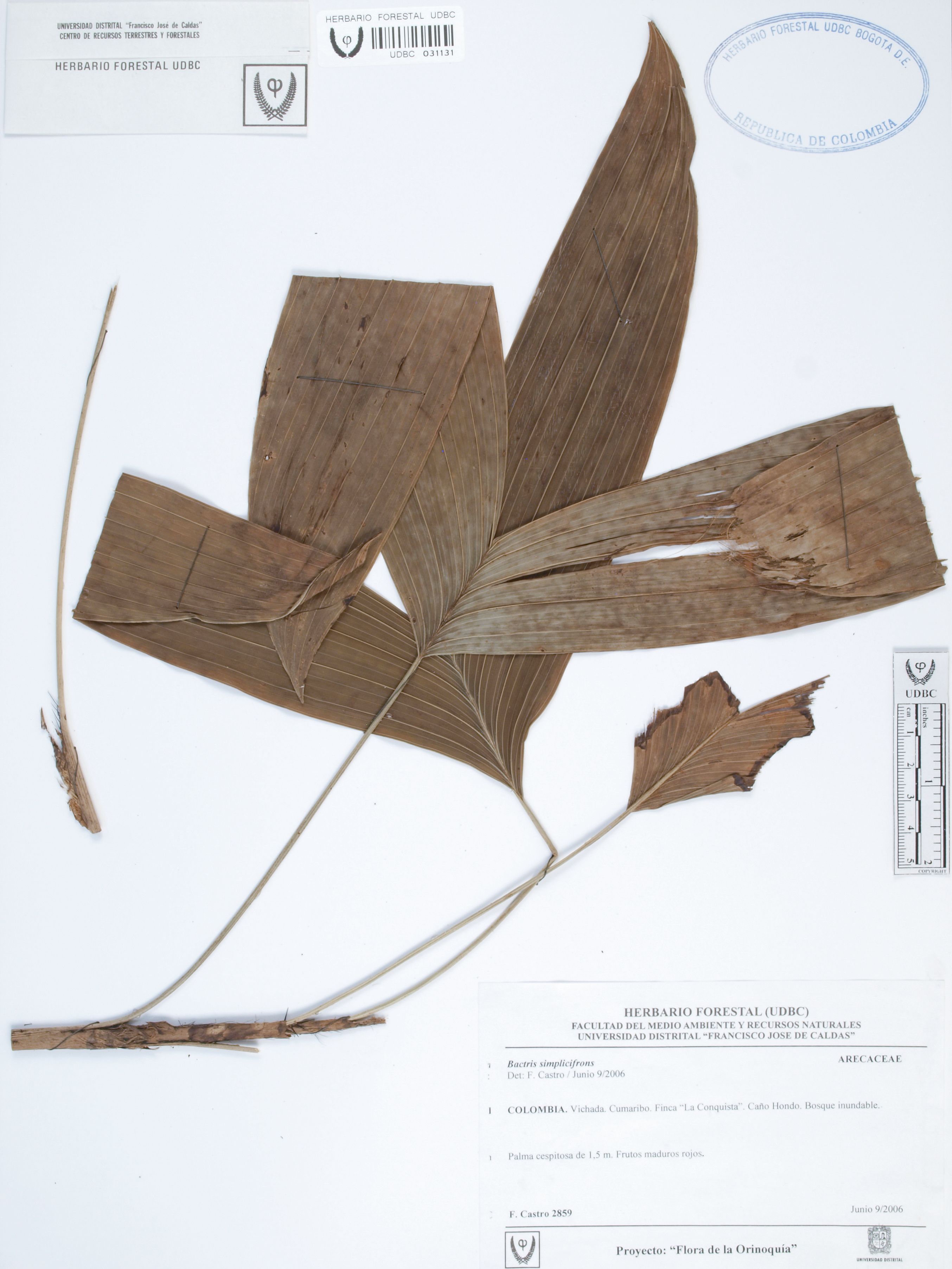 Fotografía del ejemplar Castro, F. 2859, determinado como Bactris simplicifrons en el año 2006
