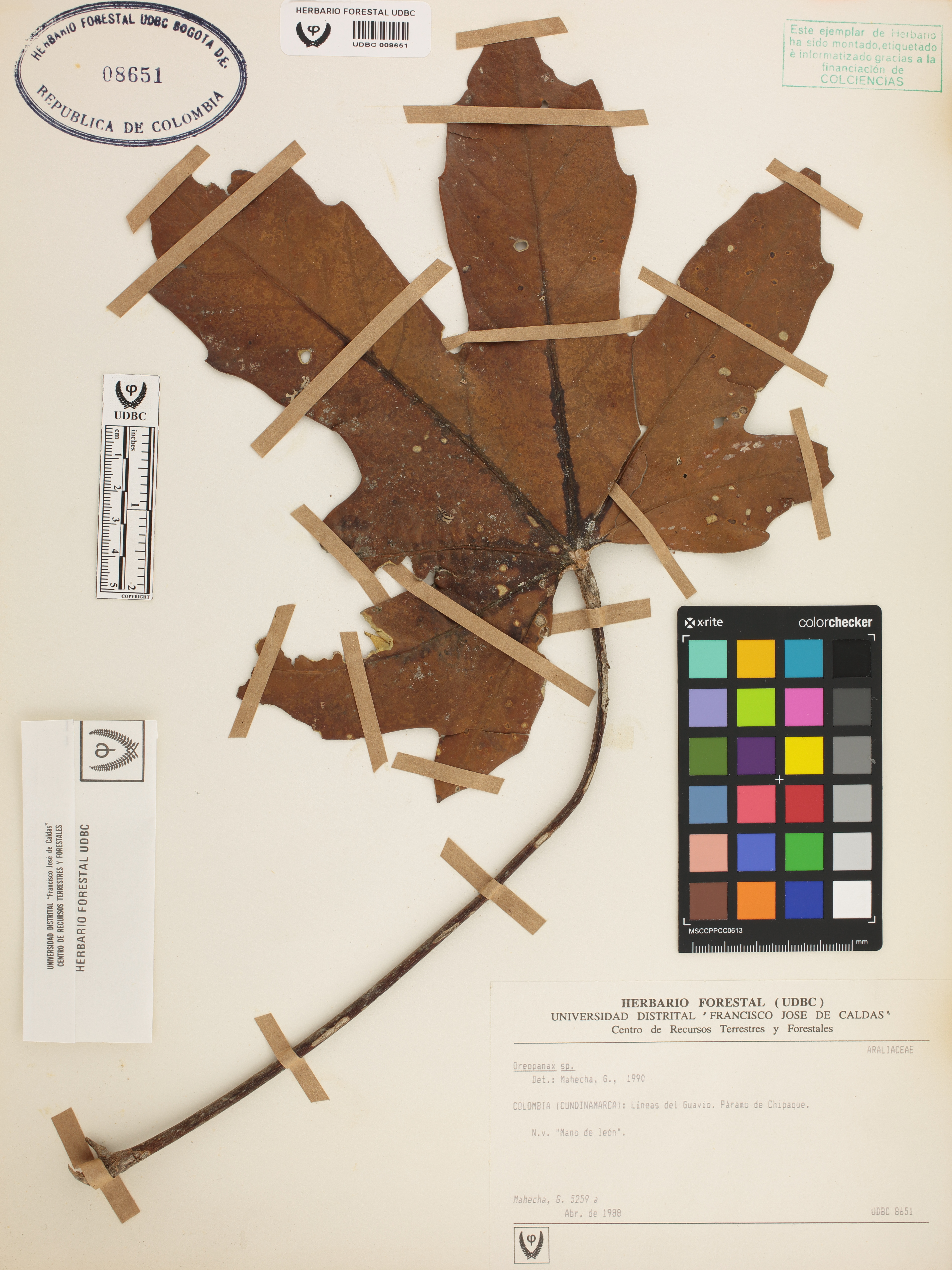 Fotografía del ejemplar Mahecha, G. 5259, determinado como Oreopanax sp. en el año 1990