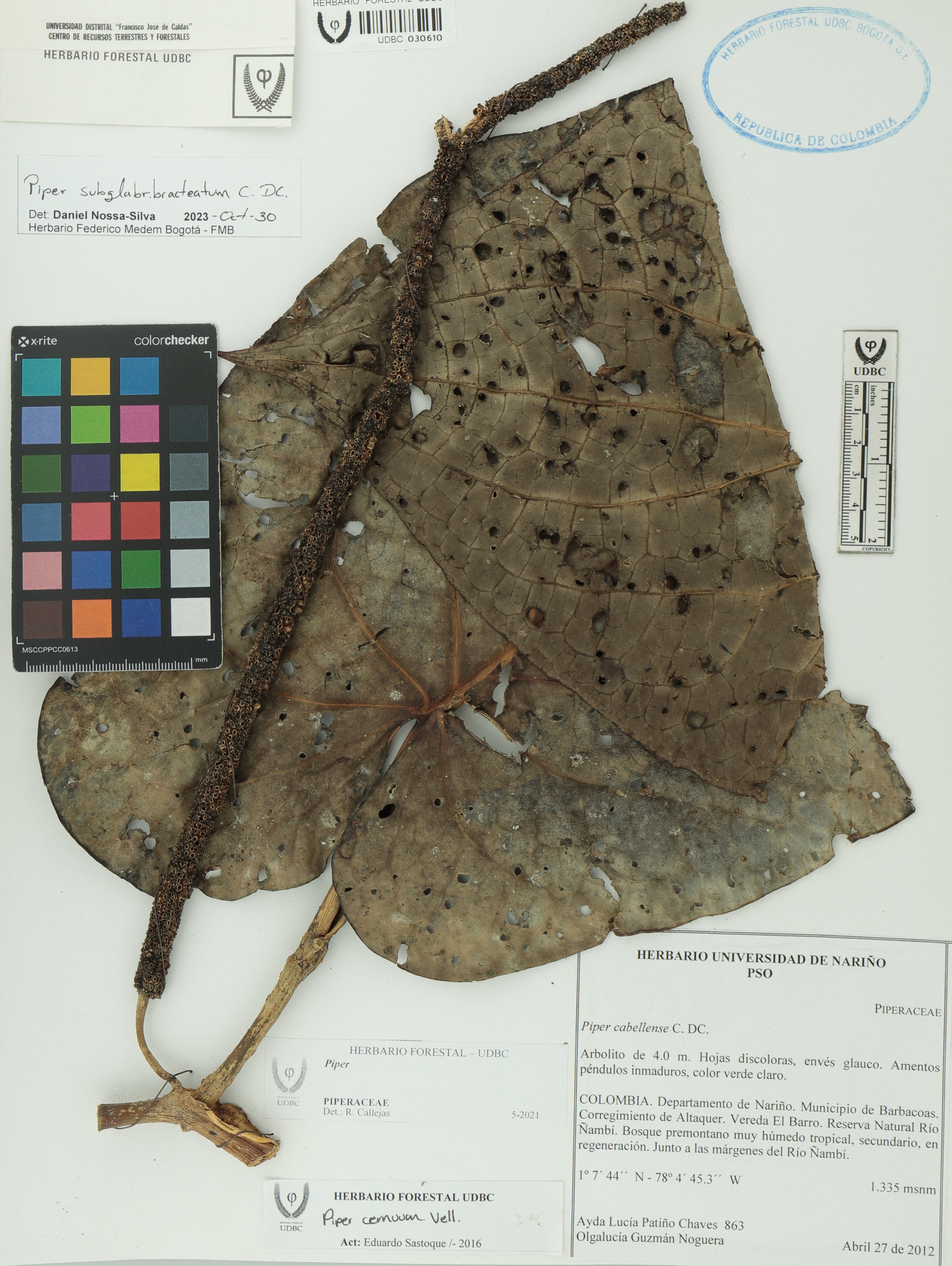 Fotografía del ejemplar Patiño, A. 863, determinado como Piper subglabribracteatum en el año 2023
