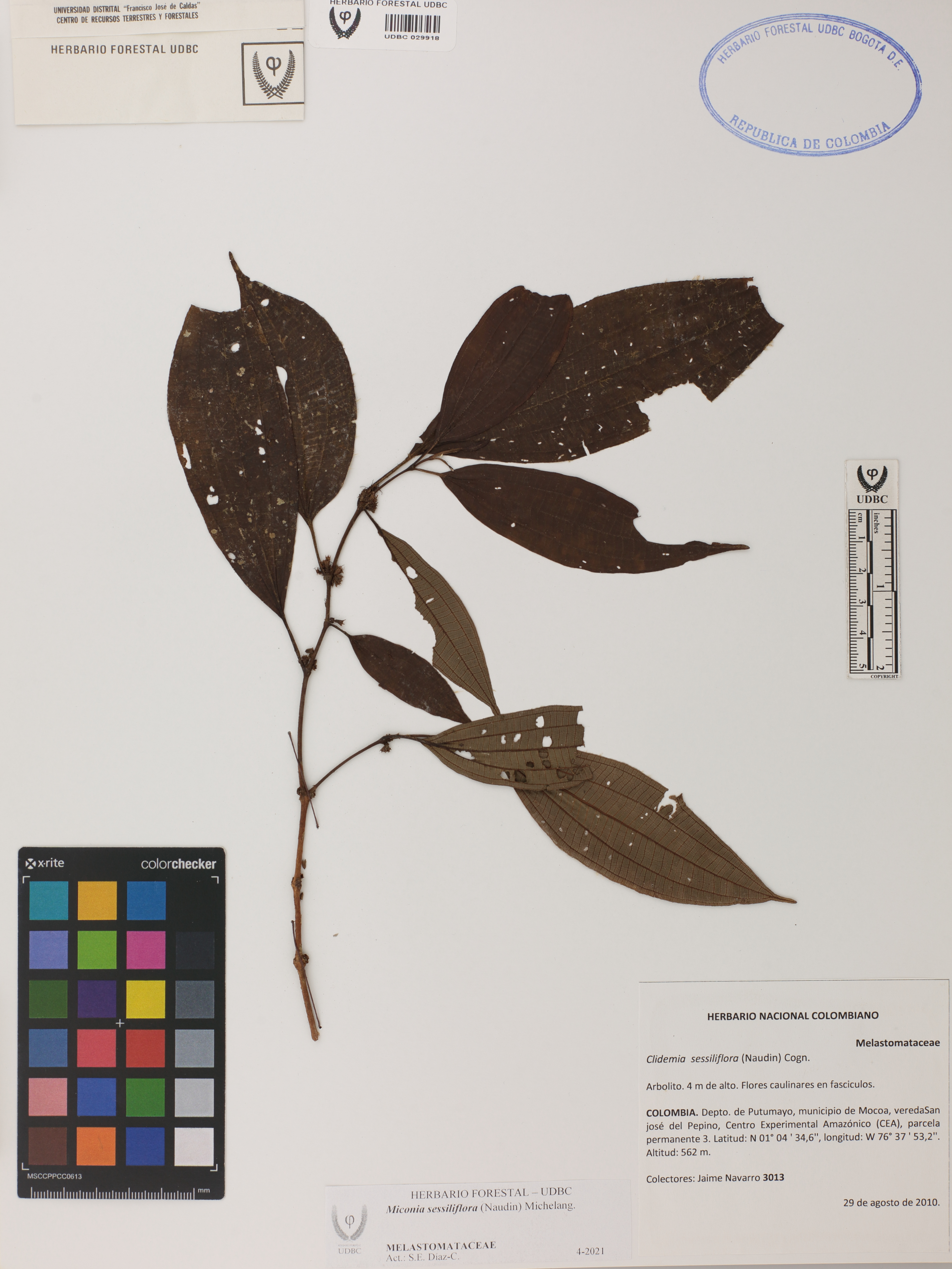 Fotografía del ejemplar Navarro, J. 3013, determinado como Miconia sessiliflora en el año 2010