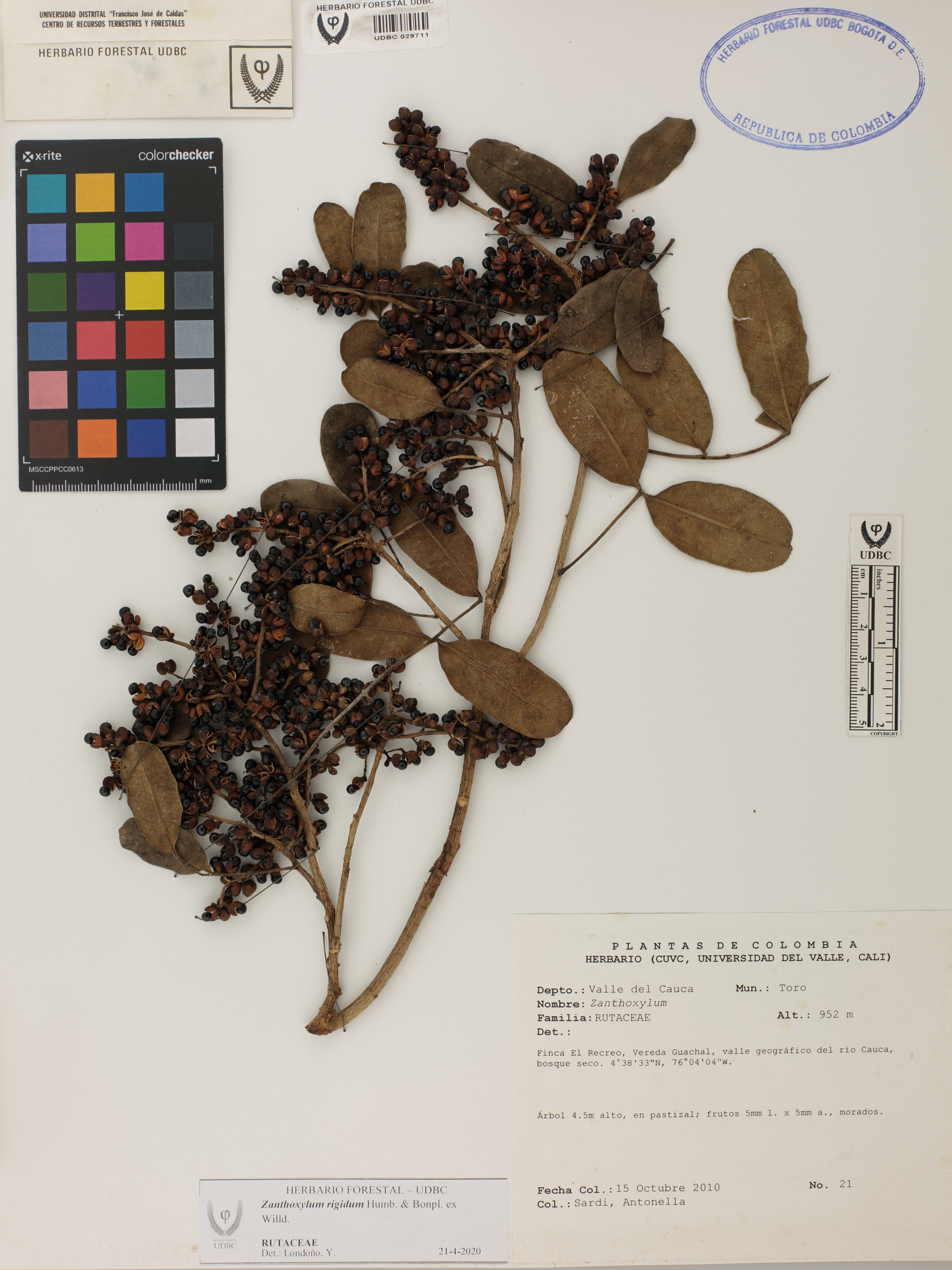 Fotografía del ejemplar Sardi, A. 21, determinado como Zanthoxylum rigidum en el año 2020