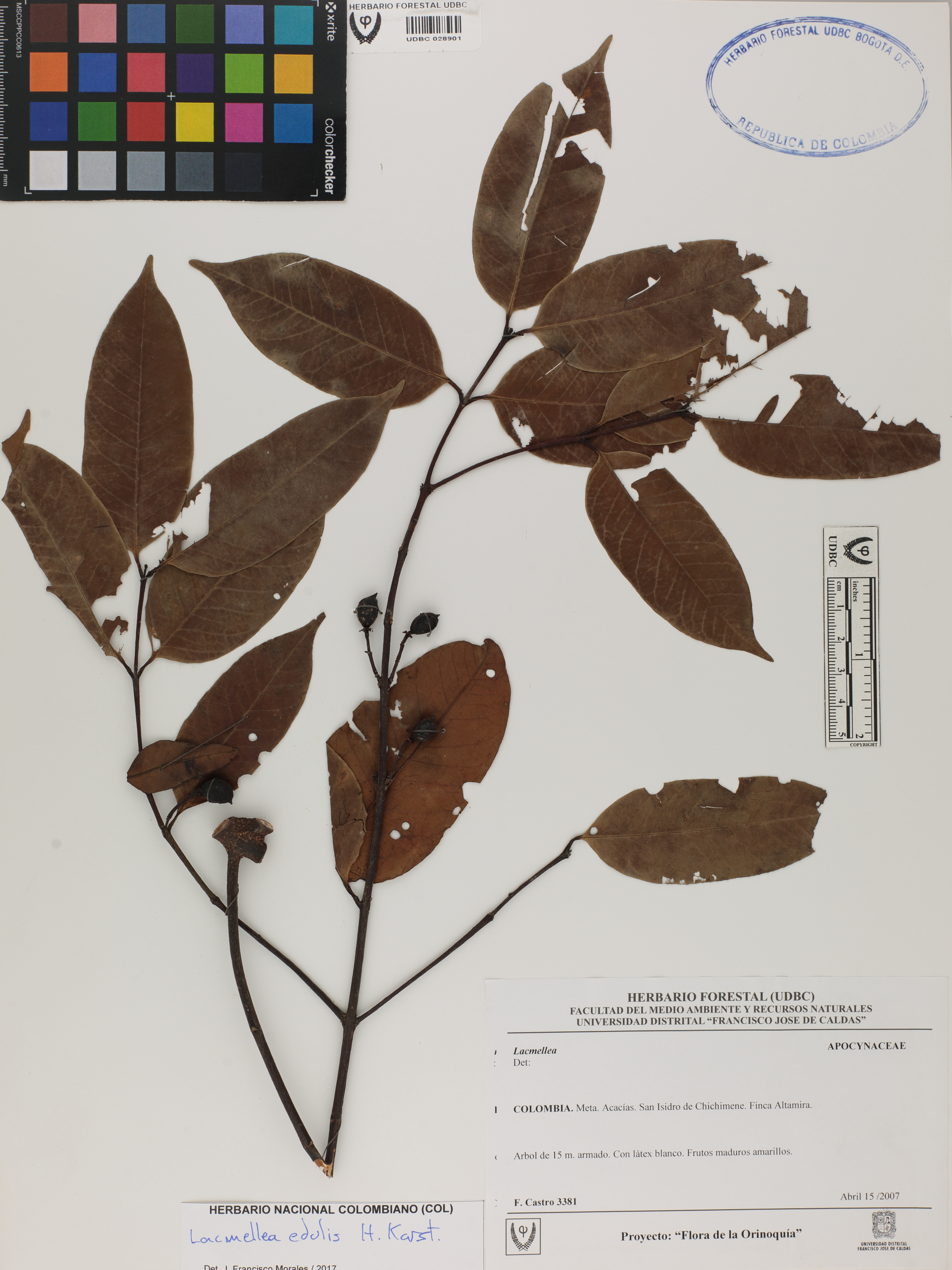 Fotografía del ejemplar Castro, F. 3381, determinado como Lacmellea edulis en el año 2017