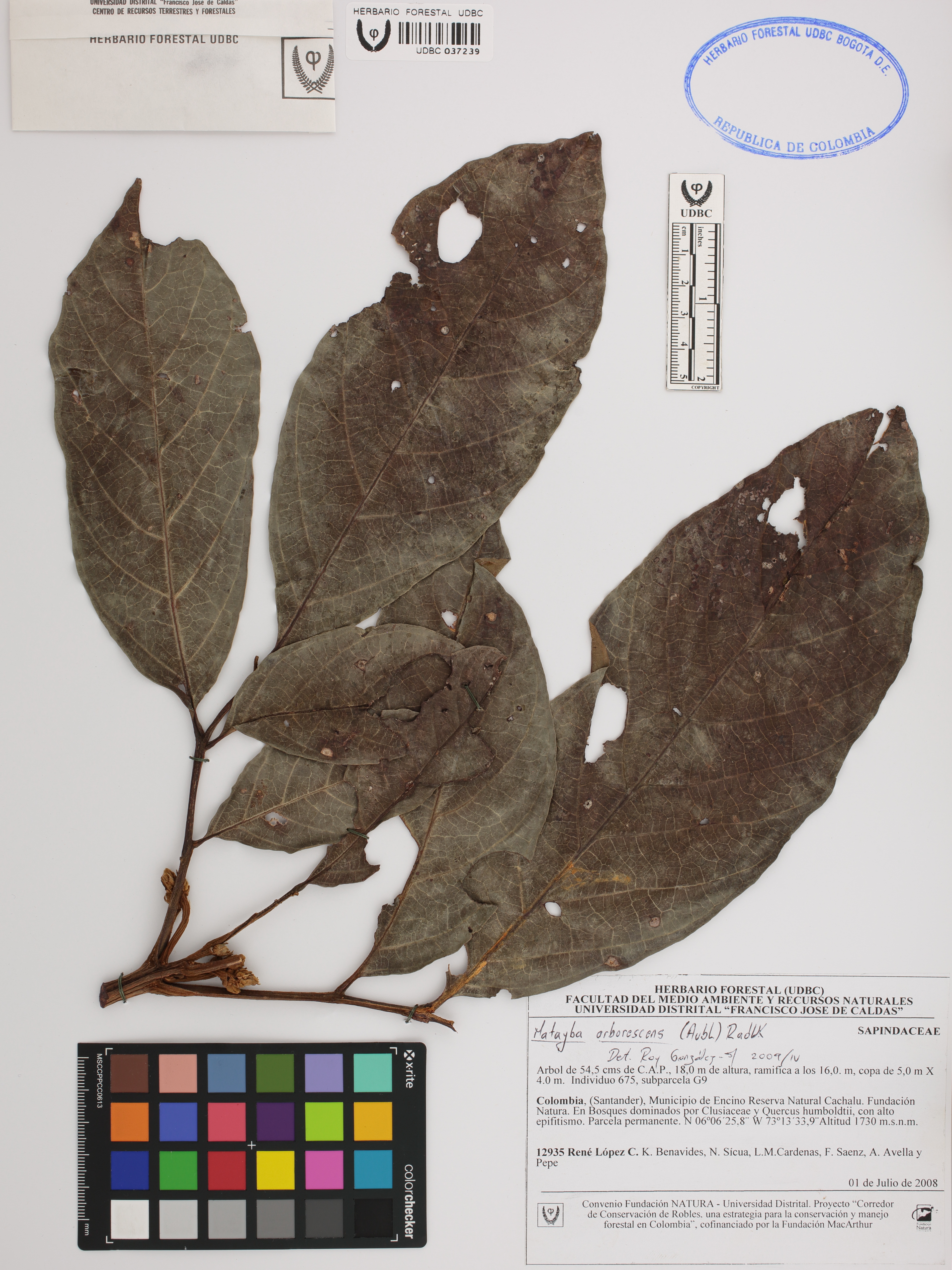 Fotografía del ejemplar López, R. 12935, determinado como Matayba arborescens en el año 2009