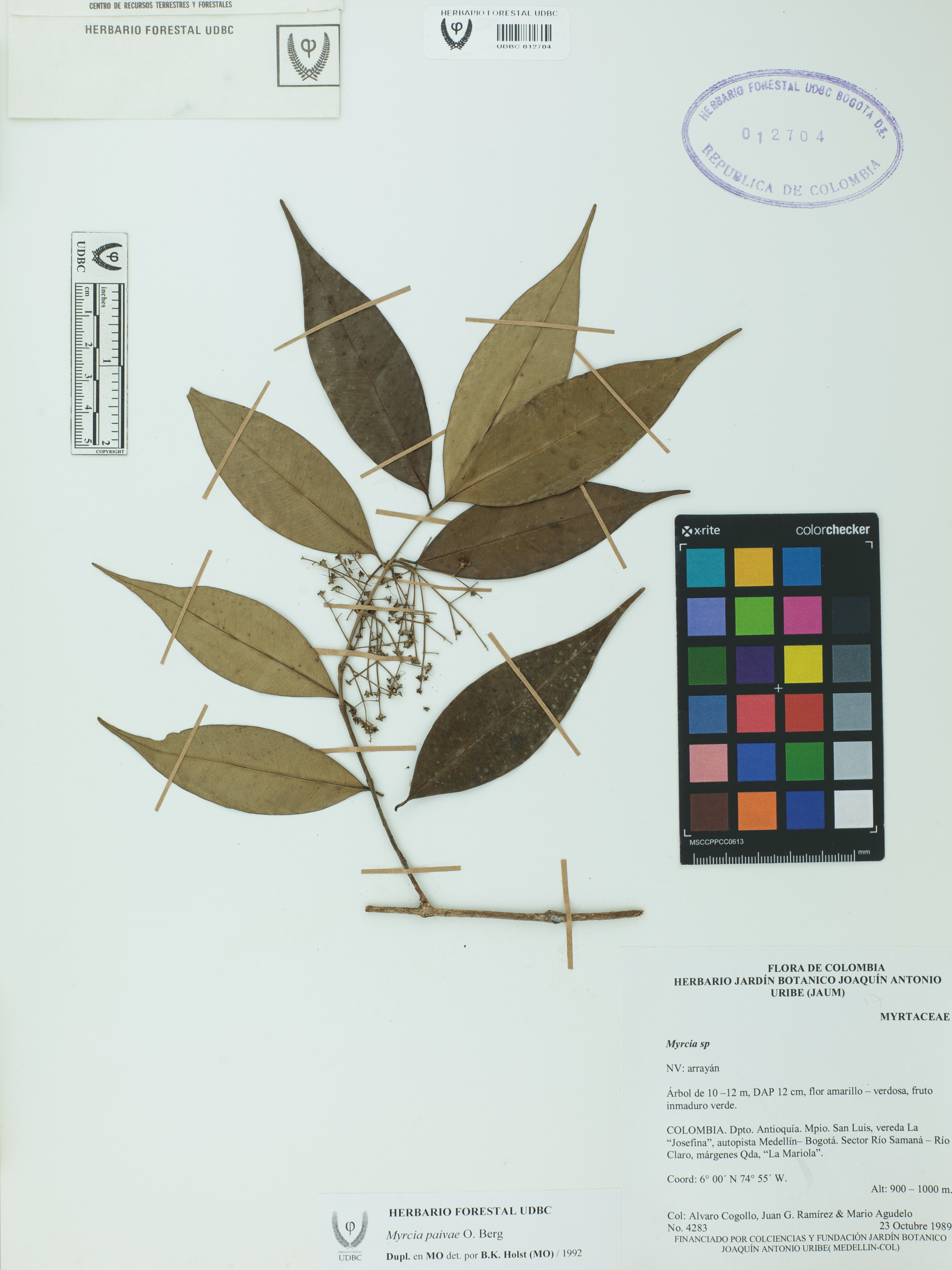 Fotografía del ejemplar Cogollo, A. 4283, determinado como Myrcia paivae en el año 1992