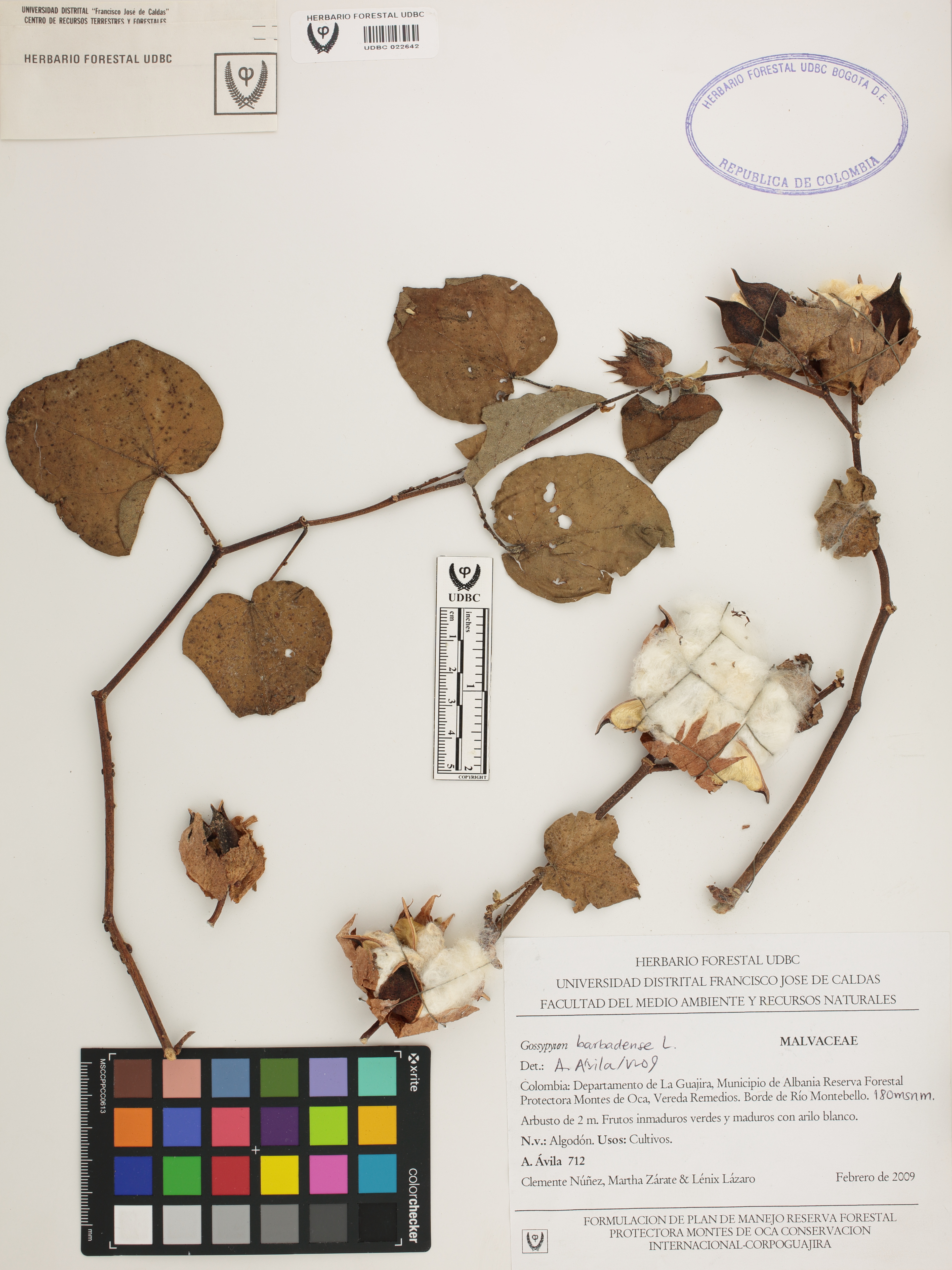 Fotografía del ejemplar Ávila, A. 712, determinado como Gossypium barbadense en el año 2009