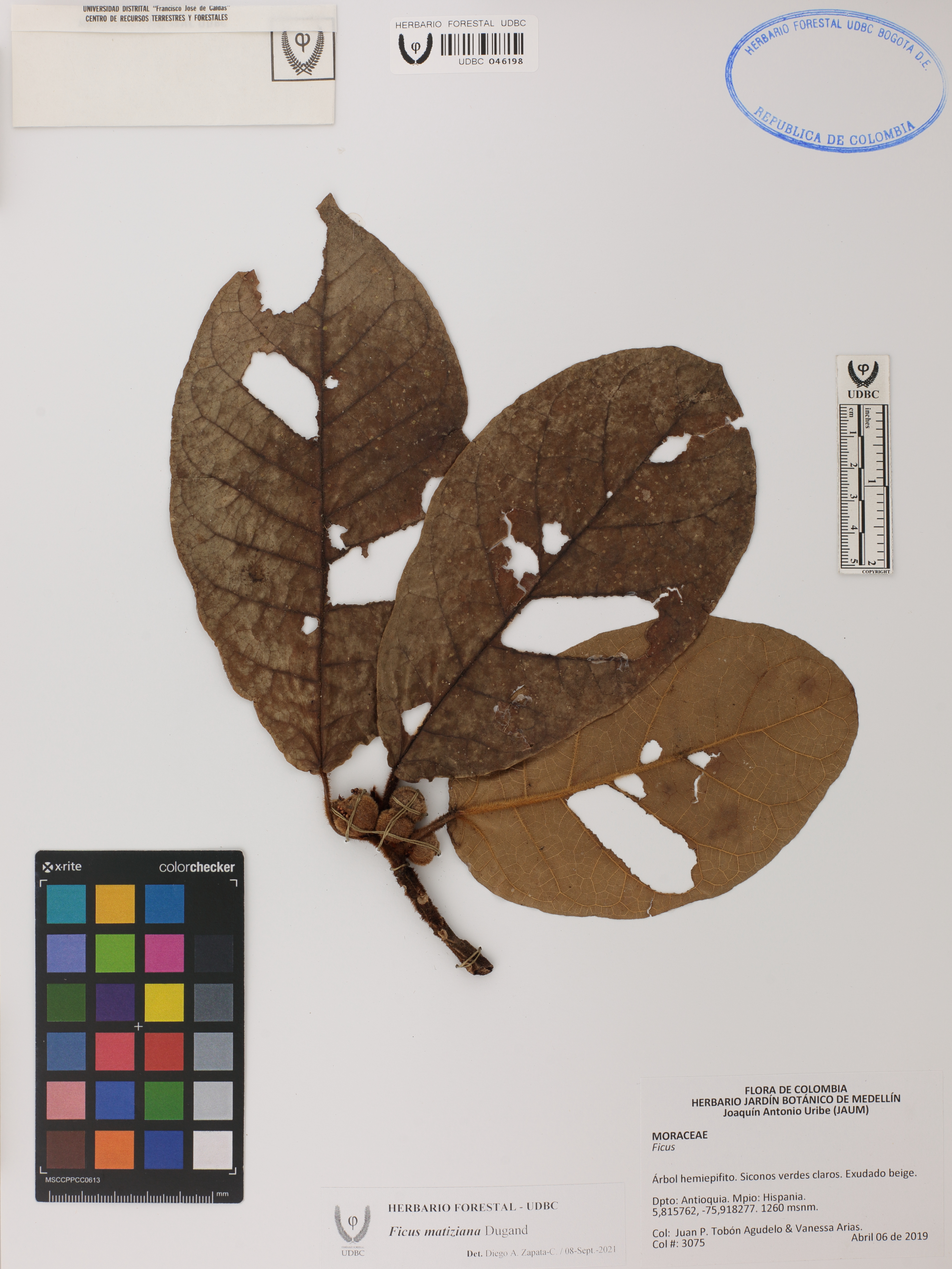 Fotografía del ejemplar Tobón-Agudelo, J. 3075, determinado como Ficus matiziana en el año 2021