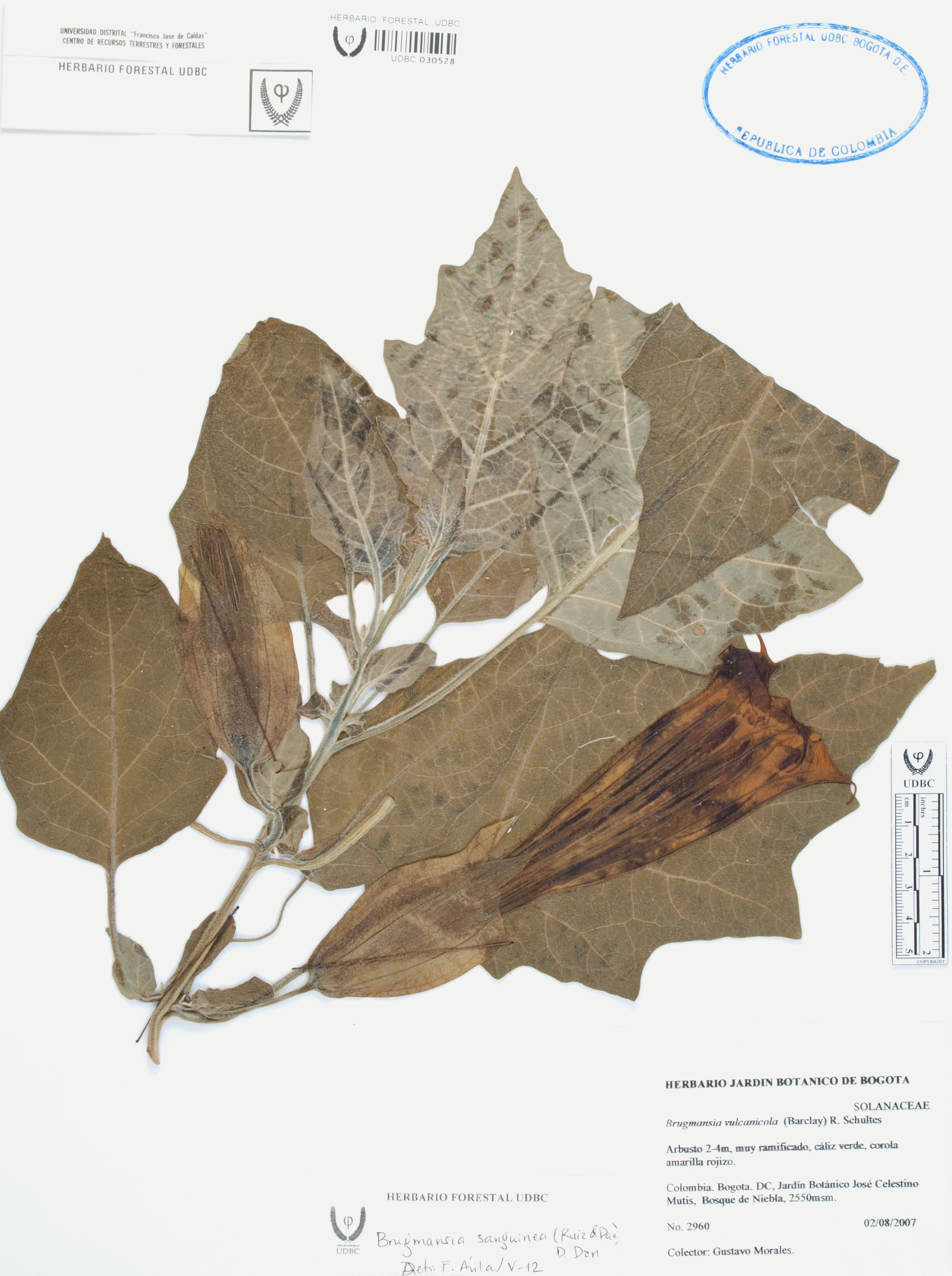 Fotografía del ejemplar Morales, G. 2960, determinado como Brugmansia sanguinea en el año 2012