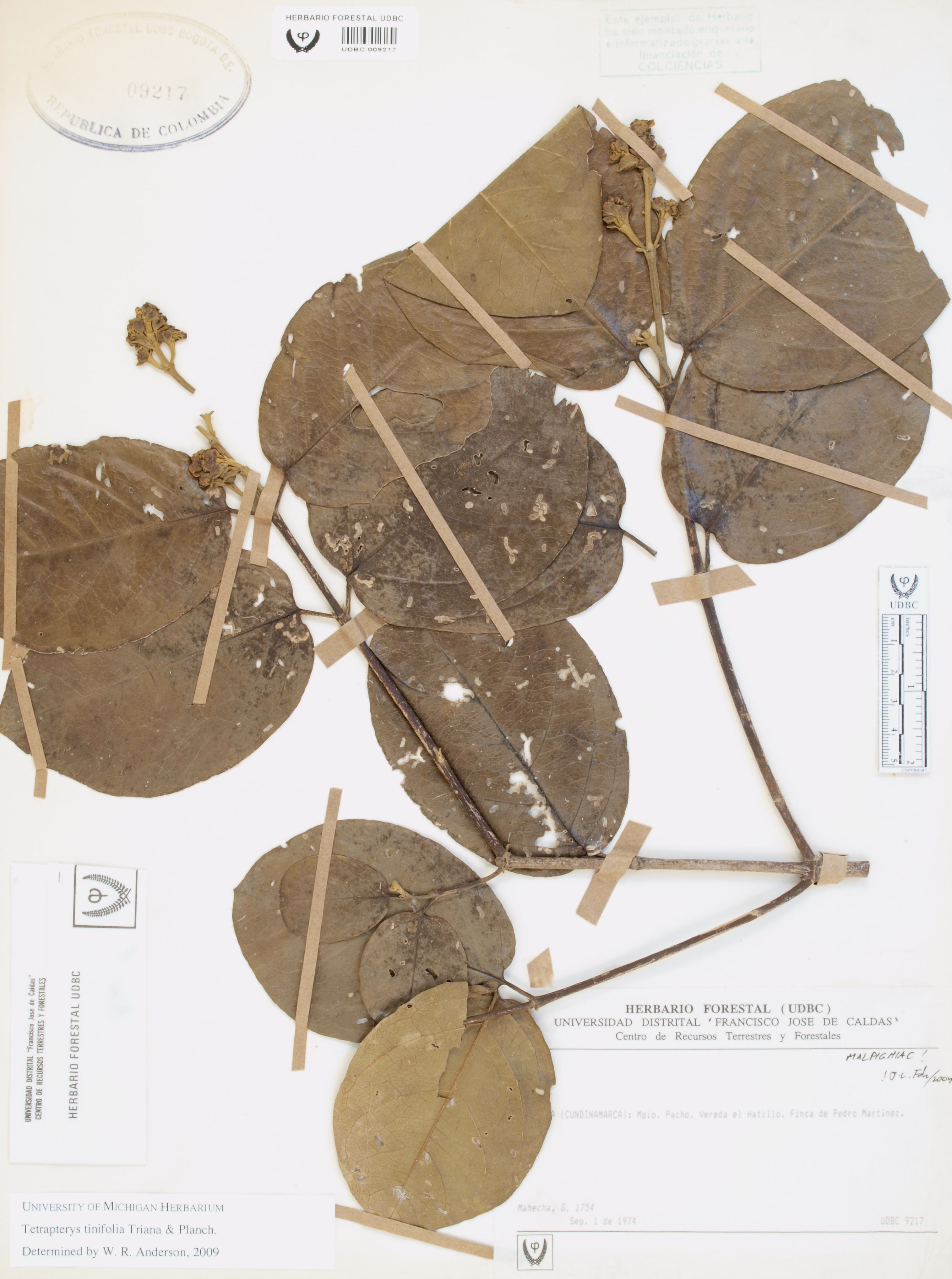 Fotografía del ejemplar Mahecha, G. 1754, determinado como Tetrapterys tinifolia en el año 2009