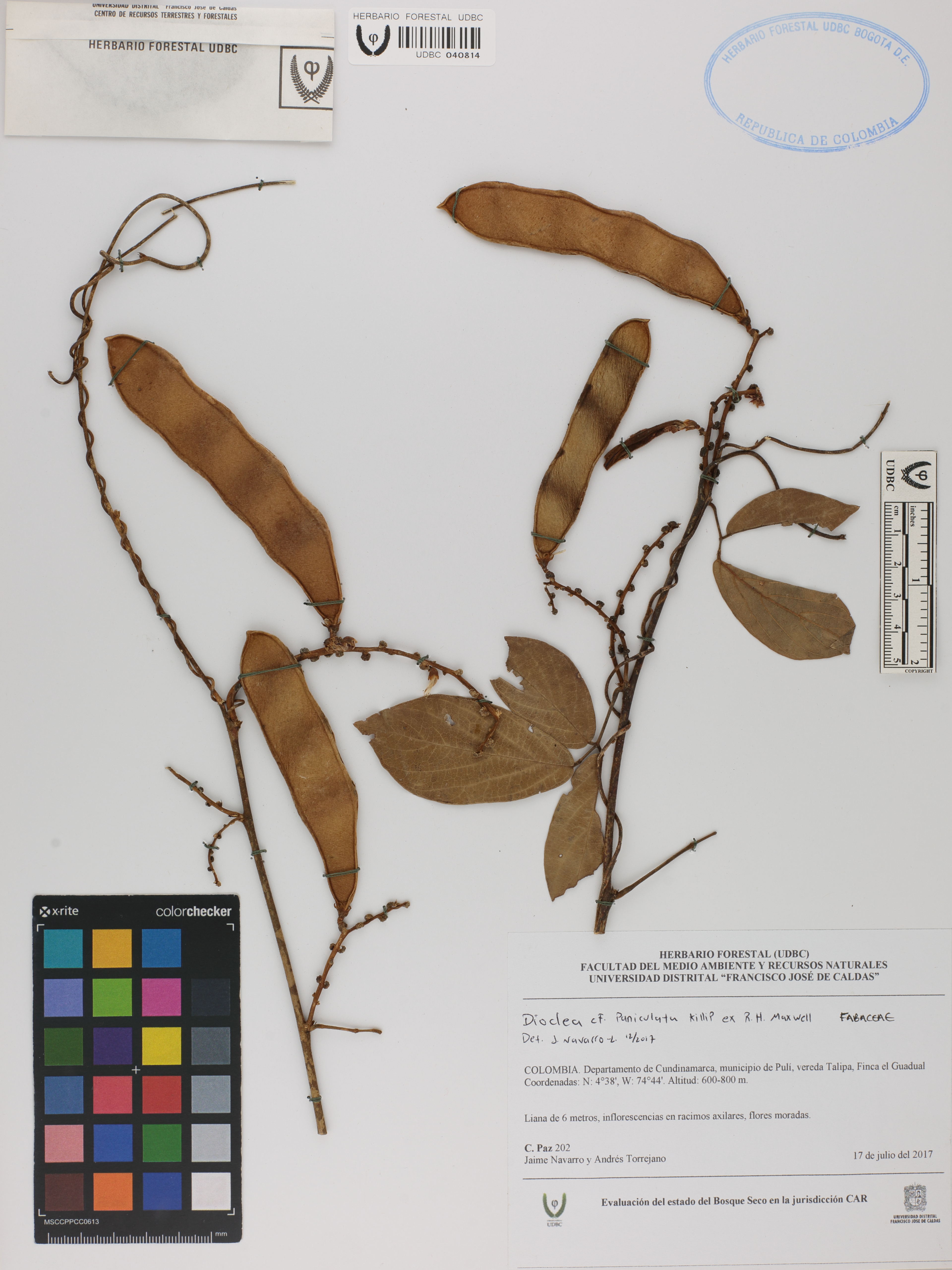 Fotografía del ejemplar Paz, C. 202, determinado como Dioclea paniculata en el año 2017