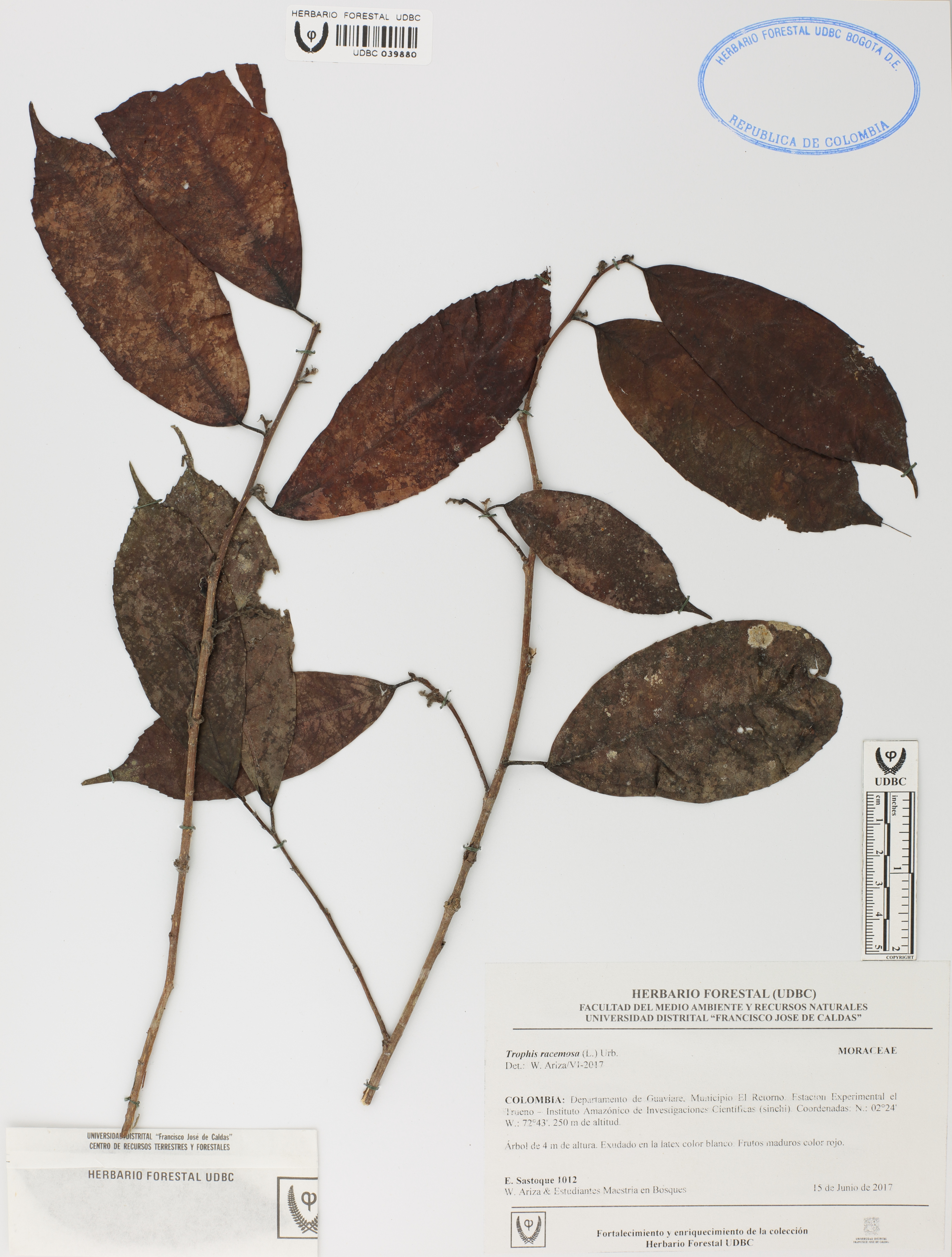 Fotografía del ejemplar Sastoque, E. 1012, determinado como Trophis racemosa en el año 2017
